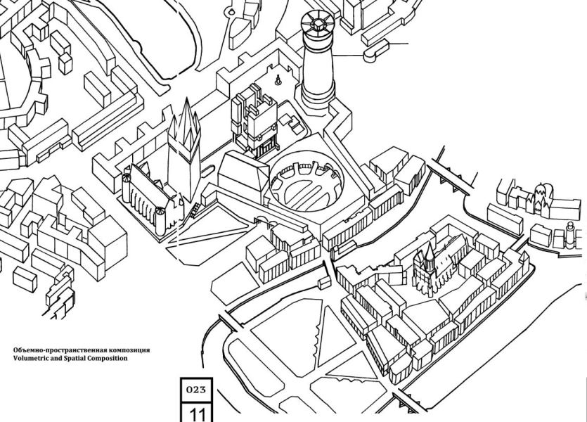 Кстати, идею плотной квартальной застройки, в которую должен быть вписан Дом Советов, можно встретить у многих участников конкурса. Как правило, это доходные дома или гостиничные комплексы. Позже «Сердце города» на основании конкурсных проектов разработало консолидированную планировочную концепцию, которая также предусматривала квартальную застройку территории между Домом Советов и Зарайской. Ближе к площади должны были расположиться здания с общественно-культурными функциями, ближе к Зарайской — жилые дома с коммерческими нижними этажами. В целом застройка была предусмотрена достаточно плотная, но невысокая — от 2 до 7 этажей в зависимости от расположения. По восточной границе новой главной площади с севера на юг планировалось обустроить фонтан, имитирующий канал. Он должен был быть неглубоким, около 20 см, и не выключаться на зиму.