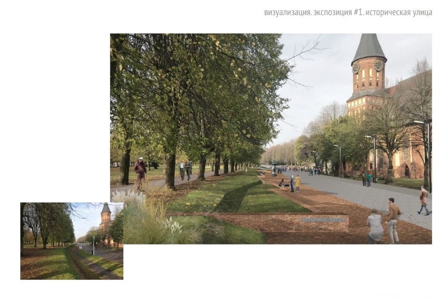 Во время восстановления собора на территории вокруг него появилось 5-7 разных типов покрытия — бетонная плитка, асфальт, те самые лещадные плиты и брусчатка разного типа. Сейчас планируется вдоль стен собора, как уже говорилось, уложить плиты, а остальную территорию замостить брусчаткой, максимально близкой к исторической. Воссоздавать мощение архитекторы хотят по образцу сохранившегося участка у Медового моста. Также проектом предусмотрено обновление подпорных стенок — с помощью клинкерного кирпича планируется воссоздать очертания довоенных улиц.