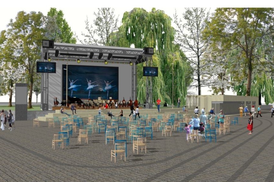 Перед Кафедральным собором архитекторы хотят сформировать площадь — передвинуть кассы, убрать клумбы и замостить всё пространство брусчаткой. на месте касс должен появиться летний амфитеатр с деревянными ступенями-лавками для отдыха и возможностью монтировать сцену для концертов. Всего, по словам Генне, на острове предусмотрено четыре площадки для проведения различных мероприятий — амфитеатр на соборной площади, поляна с видом на здание Биржи, центральная аллея и, как вариант, пространство под мостом.