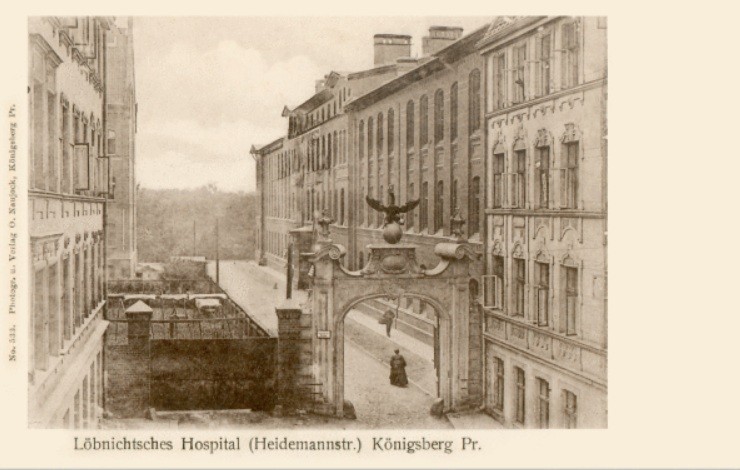 Въездной портал к Лёбенихтскому госпиталю был построен в 1771 году. Сам же госпиталь изначально появился на месте бенедиктинского монастыря в честь Святой Марии. Он находился недалеко от памятного знака морякам-балтийцам на пересечении Московского проспекта и улицы Октябрьской. В 1764 году госпиталь сгорел. Его восстановили к 1771 году. Тогда же на въезде возвели портал в стиле фридерицианского рококо, который служил въездными воротами во двор. Арку венчал орёл на каменном шаре с символами королевской власти в обеих лапах. В исторических источниках содержатся сведения о том, что эта скульптура была создана из песчаника в 1764 году неизвестным мастером. После войны она была утрачена.