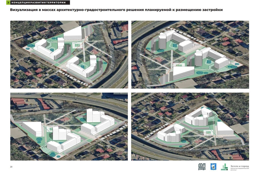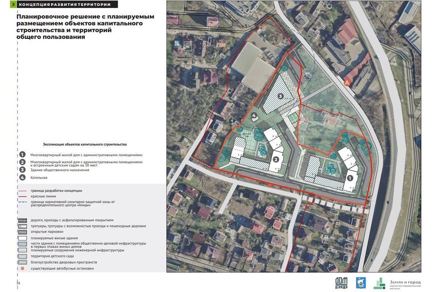 Концепция предполагает строительство двух идентичных четырёхэтажных жилых комплексов с отдельными секциями высотой 6-8 этажей. Между ними должен появиться пешеходный бульвар. «Четырехэтажная застройка по фронту приближена у нас к окружающей индивидуальной жилой застройке, для того чтобы сгладить, создать некий плавный переход от масштабов ИЖС к масштабам многоквартирной застройки», — пояснил Иванов.
