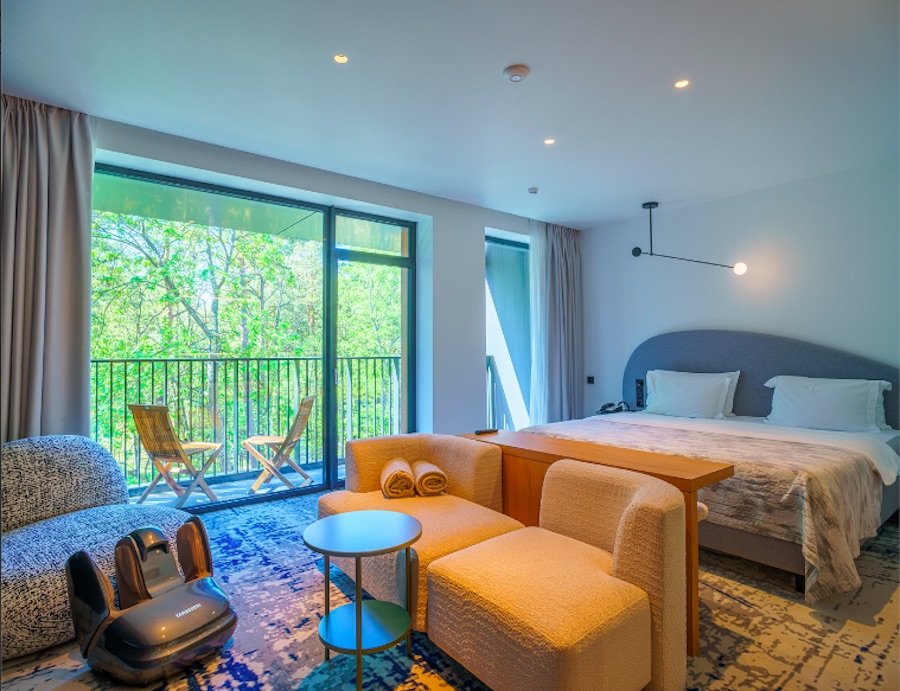 «Двухместный номер повышенного комфорта с отдельно выделенной зоной гостиной. Самый большой номер отеля. Располагается на верхнем этаже отеля и имеет балкон с видом на лес. Помимо душевой кабины, в номере есть панорамная ванна. В ванной комнате для удобства гостей, две раковины. К услугам гостей японский массажер для стоп Yamaguchi», — говорится на сайте отеля.