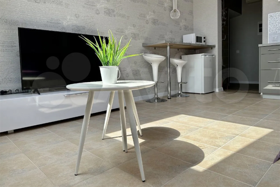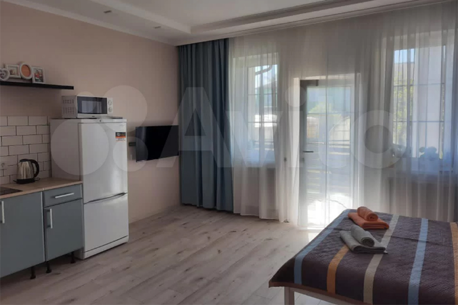 Студию площадью 30 м² на ул. Обогатительной сдают для одного или двух гостей. При этом автор объявления обещает три спальных места. «Новые и современные апартаменты с выходом на балкон» расположены в пяти минутах ходьбы от моря. Рядом также озеро Янтарное и СПА. «Придомовая территория огорожена и оснащена парковкой, беседкой, качелями и мангалом», — сообщают хозяева.
