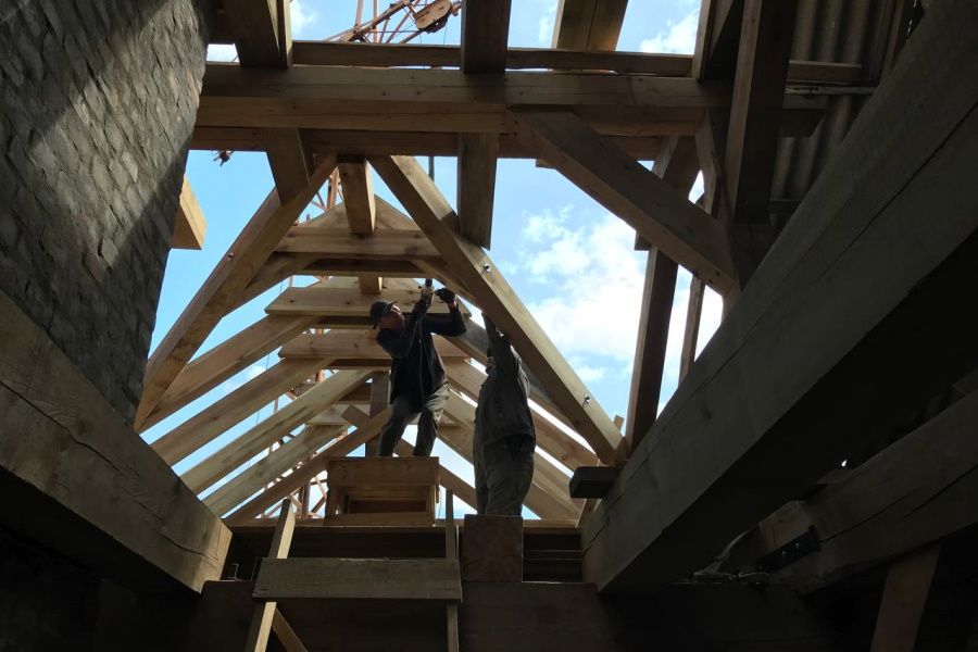 «Если смотреть на здание пивоварни со стороны центра города, то левую часть мы уже закрыли крышей. Черепицу (ее мы успели закупить в Польше за собственные средства до окончательного закрытия границы) будем укладывать через две недели. Сейчас мы обрешетку сделали, закрыли пленкой», — рассказал Наталич.
