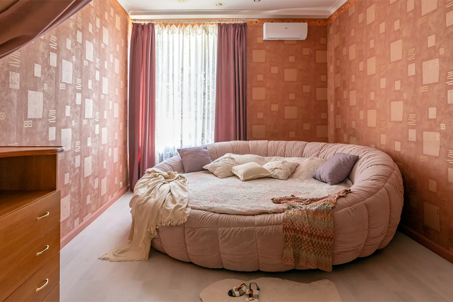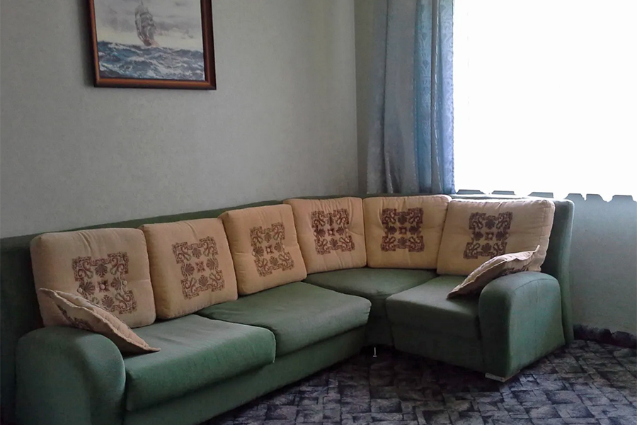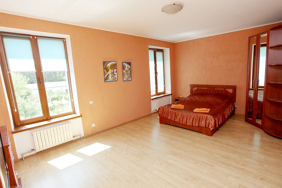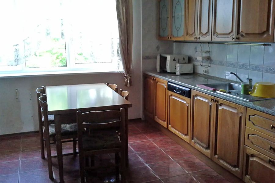 Трёхкомнатная квартира площадью 90 м² находится также на Балтийской косе на ул. Некрасова и может вместить до девяти гостей. Для них в апартаментах есть две изолированные спальни и большая гостиная «с отдельным вxoдом и личным садом». «В главной спальне находится круглая кровать с ортопедическим матрасом диаметром 2,20 м, кондиционер», — обещает автор объявления. Путь до моря займёт 3 минуты.