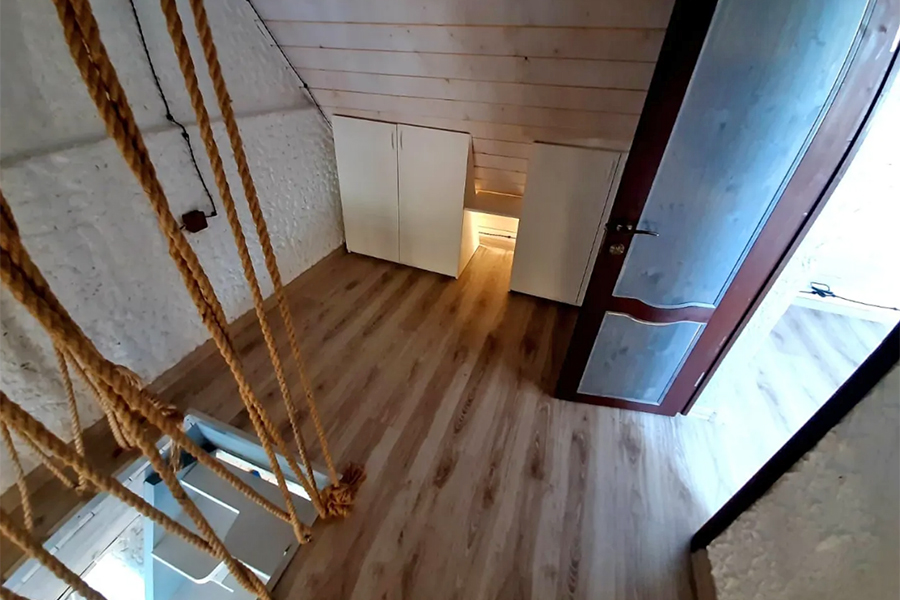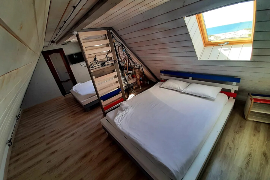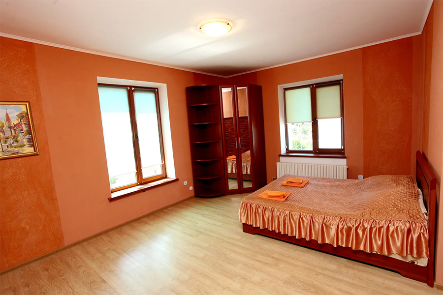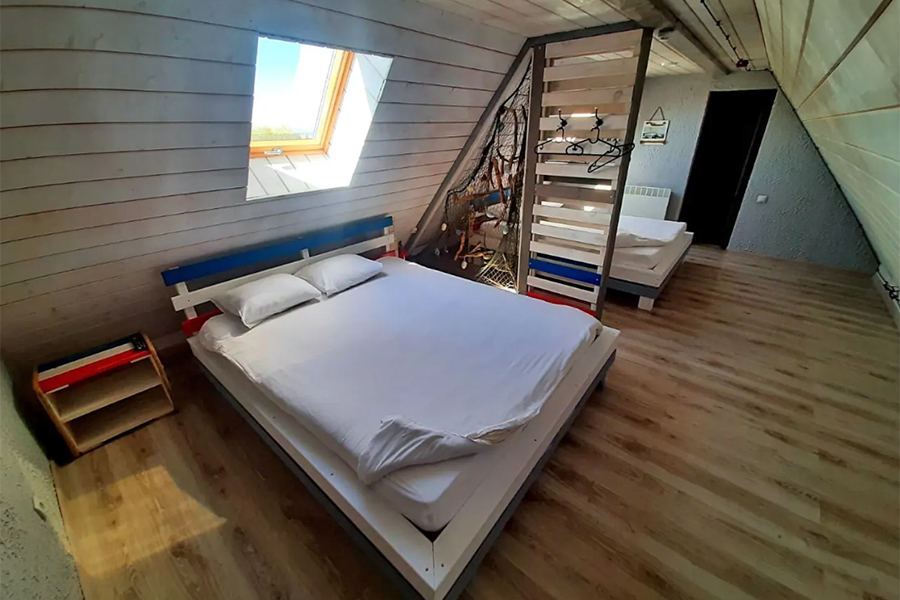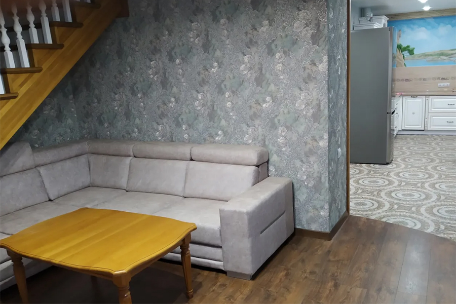 «Практически вся мебель из натурального дерева. Двухуровневая квартира с дизайнерским ремонтом на 4 этаже возле моря. Из окна (с балкона) вид на город и частично залив», — отмечает автор объявления. От моря гостей отделяют 530 метров — «недалеко, если без маленьких детей», — уточняет автор одного из отзывов. Гости также оценили цоколь с сауной и караоке.
