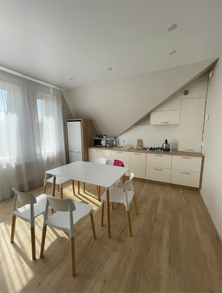 Однокомнатная квартира площадью 60 м² расположена на третьем этаже трёхэтажного дома в переулке Пушкина в 180 метрах от моря. Для максимум троих гостей в апартаментах есть двуспальная кровать и раскладной диван, а также кухня-гостиная. Указанный минимальный срок проживания — от одних суток. В квартире запрещены курение, вечеринки, мероприятия и питомцы. Однако приветствуются дети любого возраста. Автор единственного отзыва оценил проживание одним словом — «великолепно».