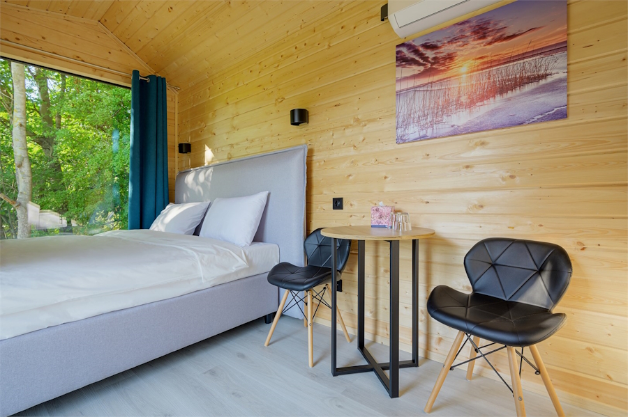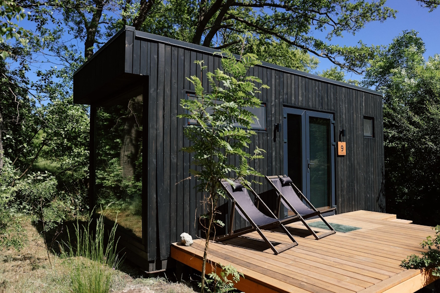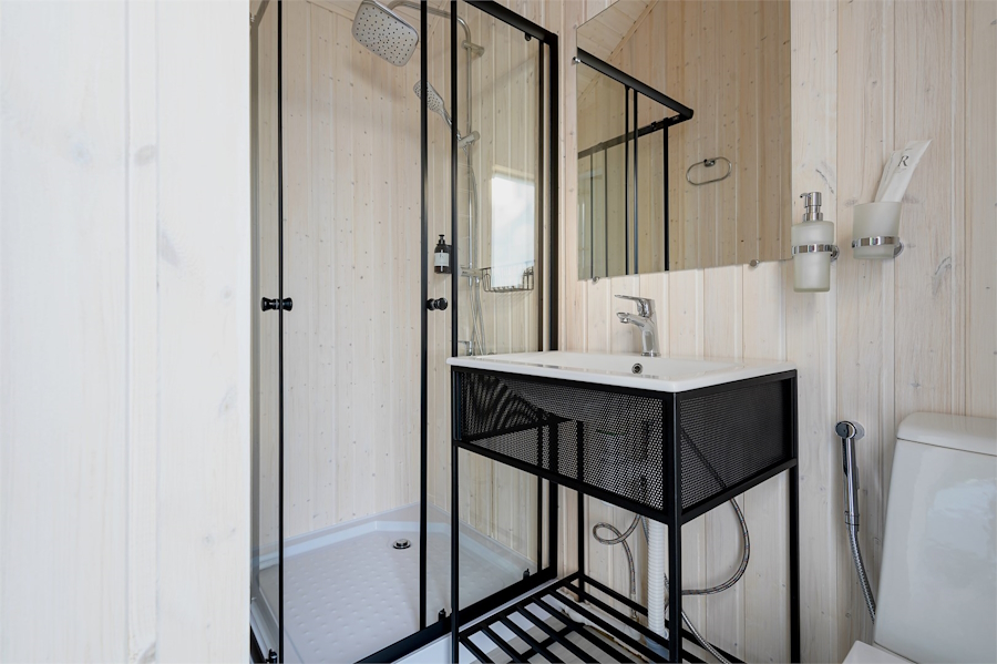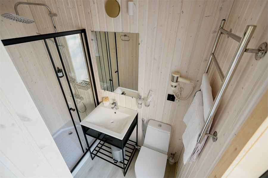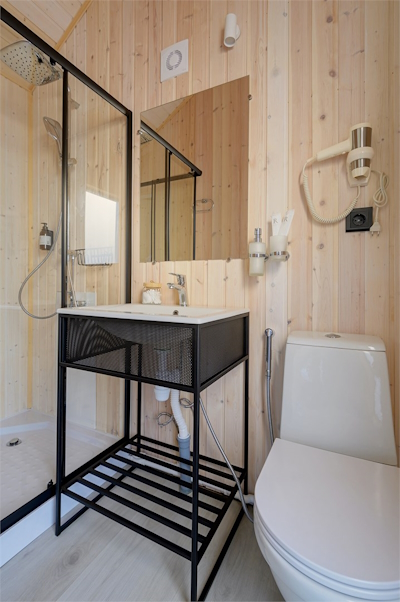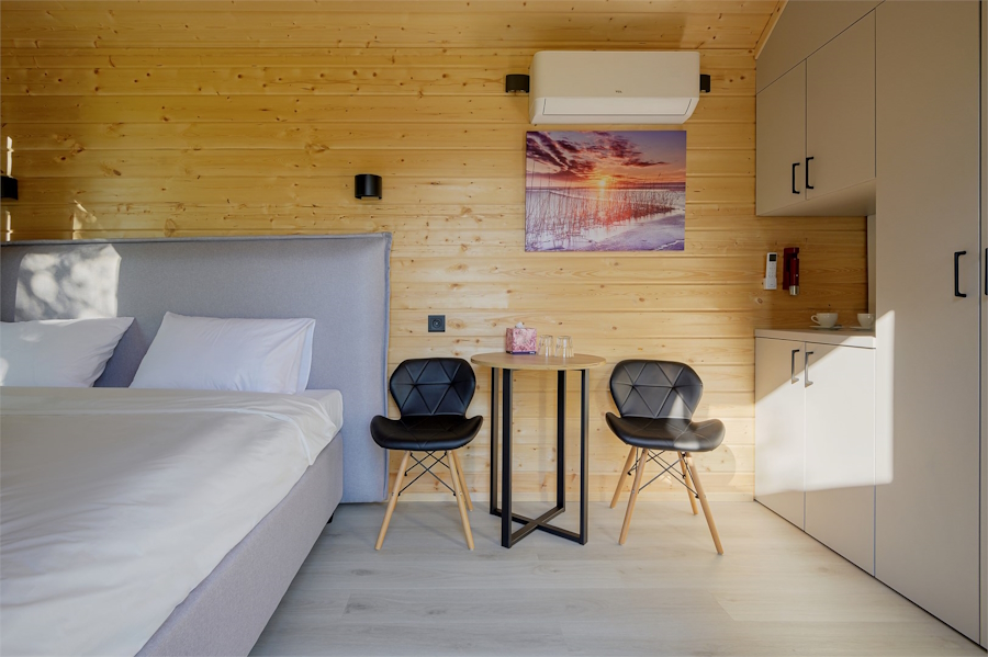 За 15 300 рублей (цена указана с учётом скидки 10%) предлагают забронировать «малый Хитте» с террасой, панорамным окном и видом на лес. Площадь домика 13 м², вместимость — до двух человек. В их распоряжении кухня, двуспальная кровать, ванная с косметическими принадлежностями, терраса, кондиционер, отопление и электрошторы.