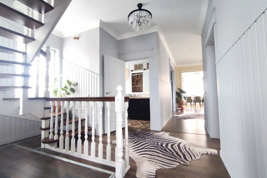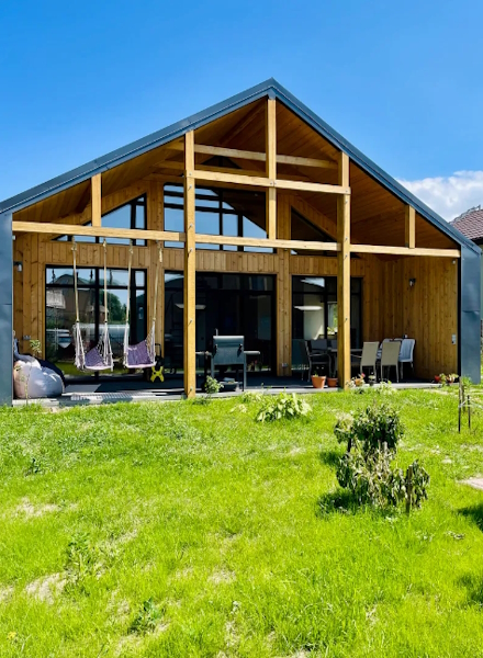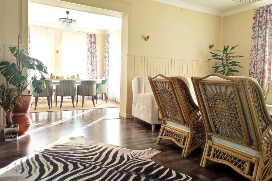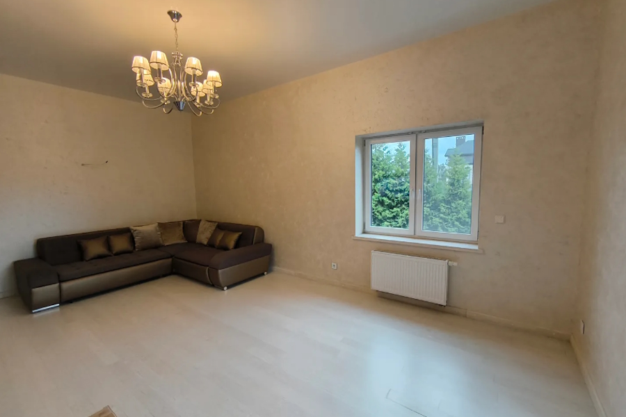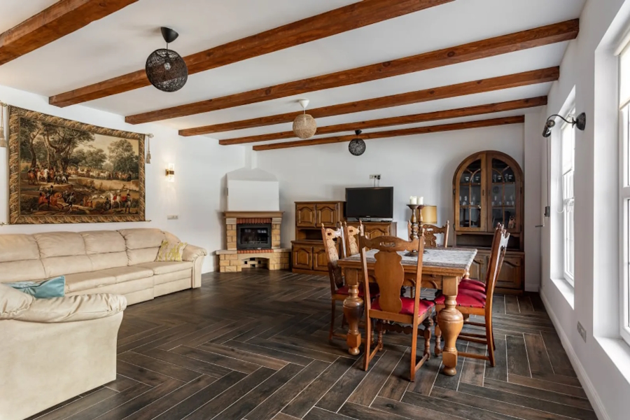 Трёхэтажный дом площадью 223 м² находится на ул. Озёрной, в 670 метрах от Синявинского озера и 800 метрах от пляжа. Здесь смогут разместиться максимум восемь гостей. Для них в четырёх спальнях предусмотрены пять кроватей. Также в доме есть большая гостиная, два санузла, терраса и балкон. На огороженной территории — парковочное место, оборудование для барбекю, шезлонги, кресла и зонтики. За дополнительную плату возможна установка бассейна.