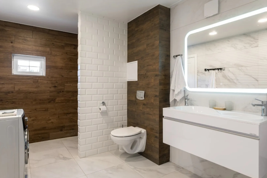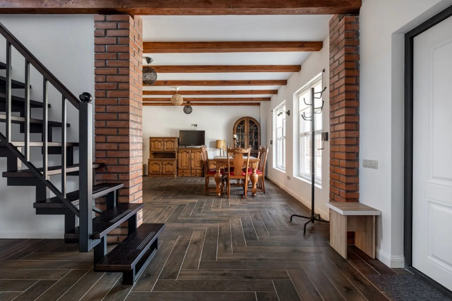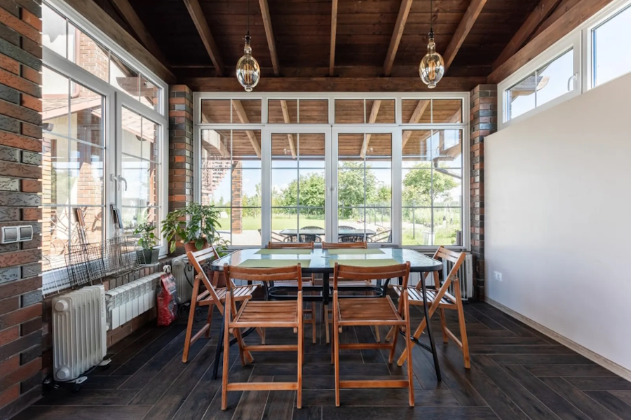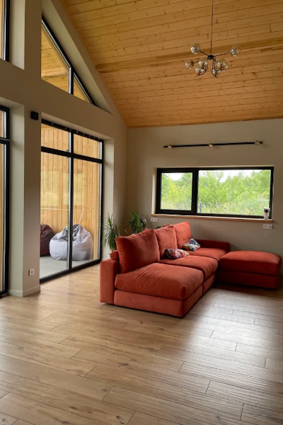 Двухэтажный дом площадью 162 м² находится на ул. Обогатительной. Стандартное количество гостей — восемь. Размещение ещё одного человека обойдётся в 1800 рублей в сутки. Для жильцов подготовлены четыре спальни с таким же количеством кроватей. В доме два санузла, а также кухня, столовая, гостиная и балкон. В числе удобств камин, кулер, мангал, костровая чаша, уличная мебель и парковка на две машины. За 5000 рублей можно на сутки арендовать баню в виде бочки на колёсах.