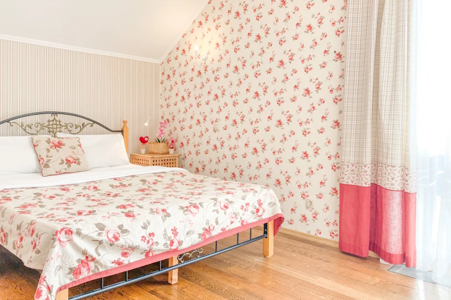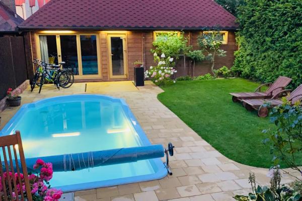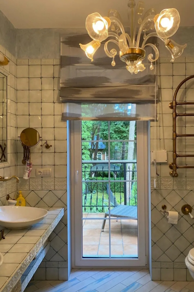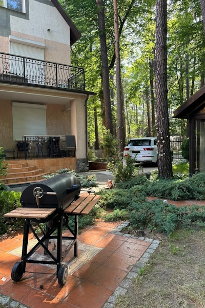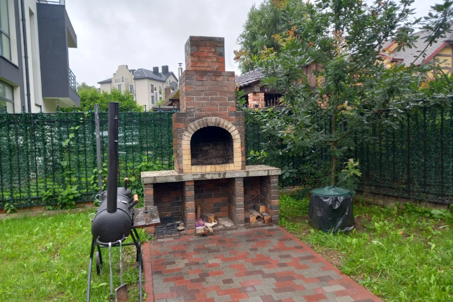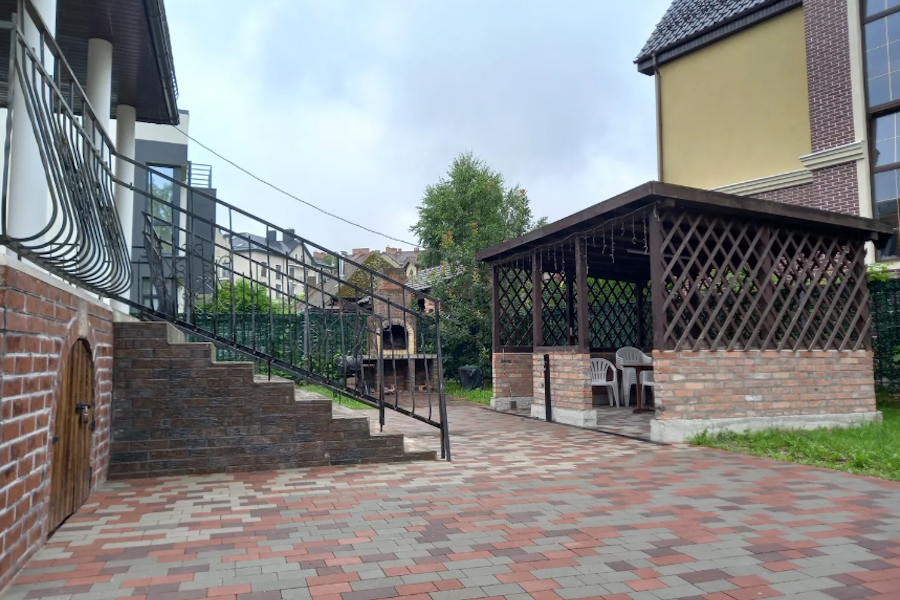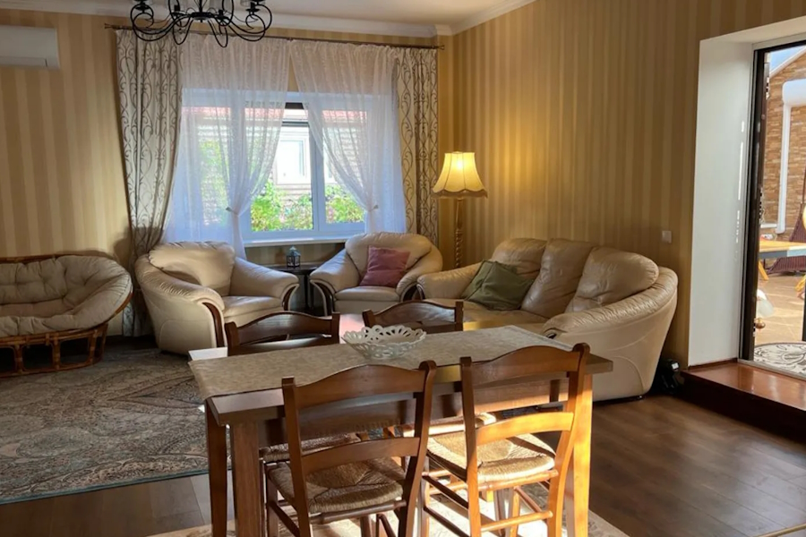 Двухэтажный дом площадью 200 м² расположен в переулке Горького и рассчитан максимум на 12 гостей. В их распоряжении будут пять спален с шестью кроватями, кухня-гостиная, три санузла, библиотека и камин. На территории есть патио-барбекю, стол для настольного тенниса, вечерняя подсветка, диван-качель, солнцезащитный зонт, веранда с плетеной мебелью и крытая парковка на две машины. По запросу предоставляются самокаты.
