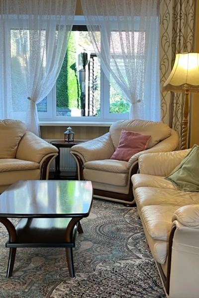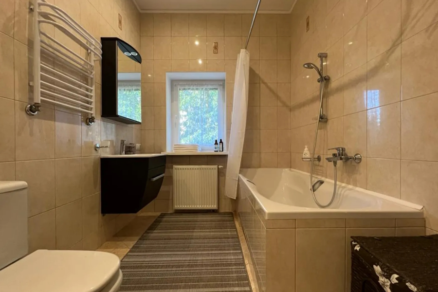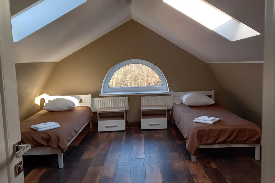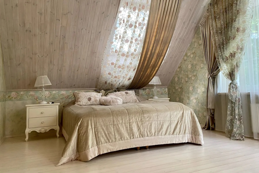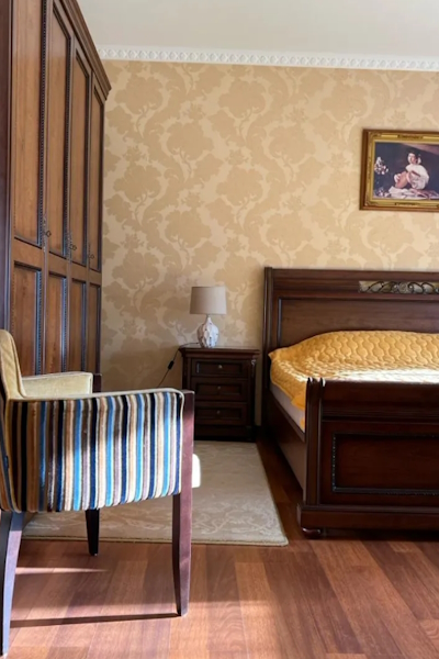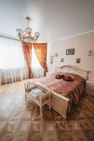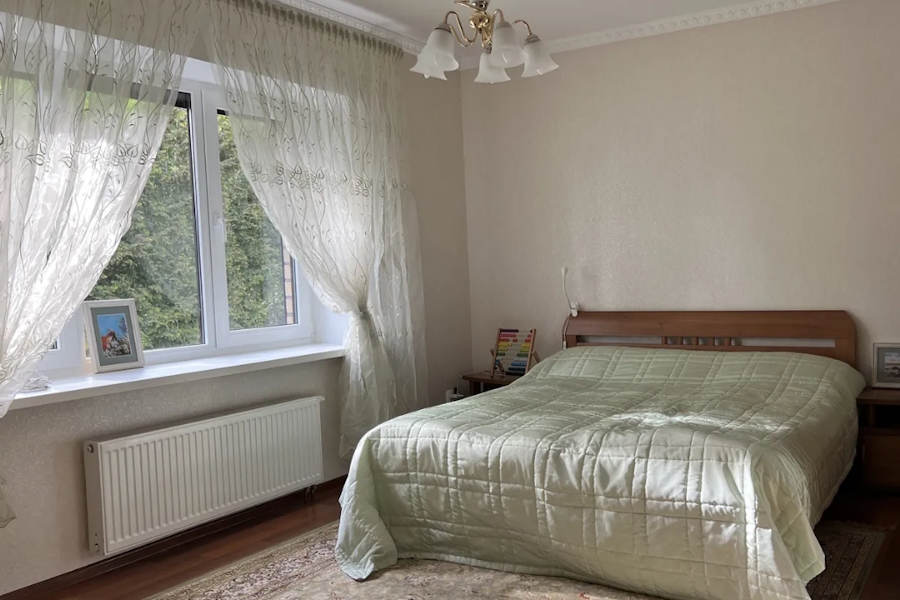 Четырёхэтажный коттедж площадью 270 м² расположен на ул. Сосновой и вмещает до 14 гостей. В их распоряжении семь спален с 13 кроватями, четыре санузла, кухня, гостиная, камин, сауна, прачечная. На территории есть мангальная зона, парковка на шесть машин, а также 14 велосипедов. «Адекватный хозяин» прилагается.