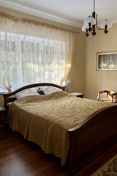 Трёхэтажный дом площадью 390 м² находится в Кедровом переулке. В распоряжении гостей пять спален. Количество кроватей не указано. На огороженной территории также расположены летний домик с мангалом и гараж. В числе основных удобств указаны посудомоечная и стиральная машины, телевизор, холодильник и интернет.