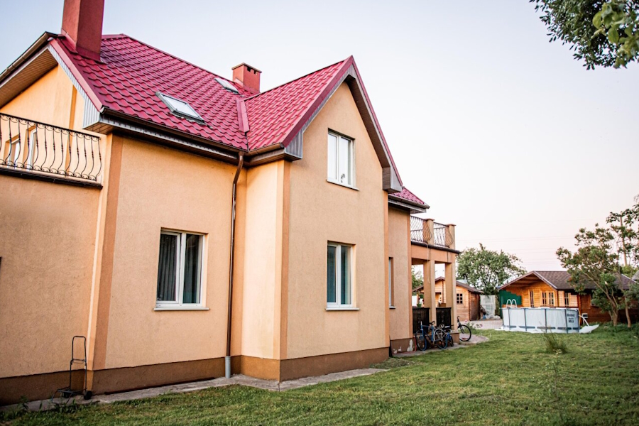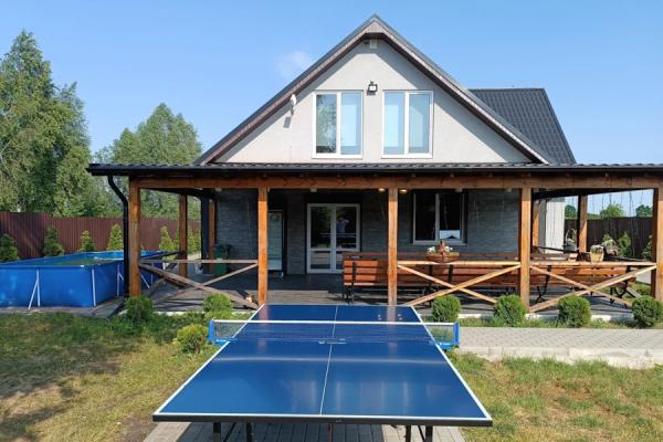 На территории установлены каркасный бассейн, стол для настольного тенниса и детский игровой комплекс. Также для гостей есть парковка на 12 автомобилей. В 250 метрах от дома находится озеро. До моря три километра.