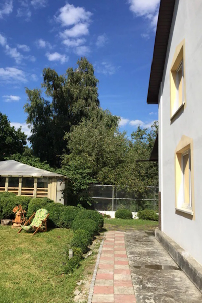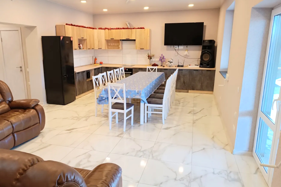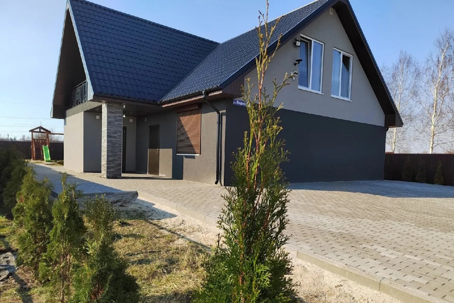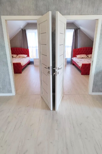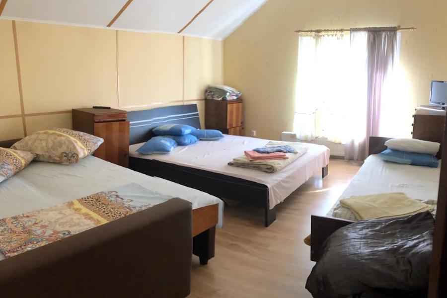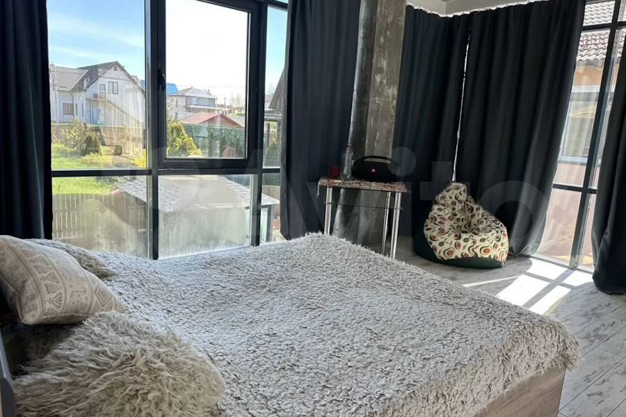 Двухэтажный дом площадью 200 м² находится на ул. Берёзовой и вмещает до десяти гостей. Для них предусмотрены пять спален, одна из которых детская, гостиная и два санузла. На территории есть баня (ей можно воспользоваться за дополнительную плату) и бассейн. Автор объявления описывает локацию как «тихое, спокойное место для семейного отдыха». От моря дом отделяют два километра, однако хозяева обещают вид на залив.