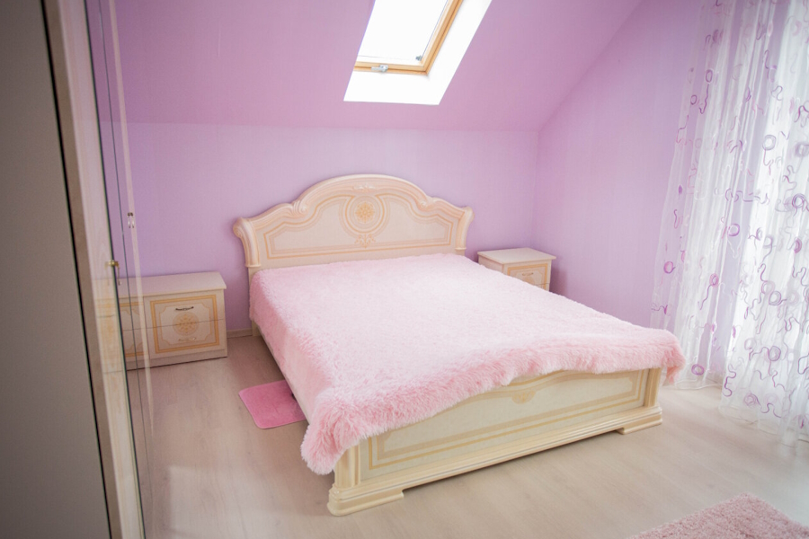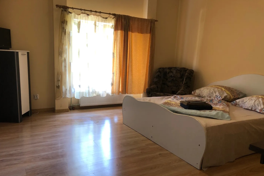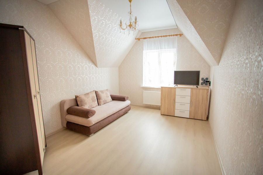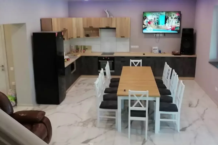Двухэтажный дом площадью 300 м² расположен на ул. Медиков. В нём могут проживать максимум 16 гостей. Им предлагают разместиться на десяти кроватях в четырёх спальнях. На территории дома находятся зона барбекю, беседка, летняя кухня, зал на 30 гостей, караоке, сауна на дровах, парковка и бассейн.