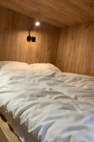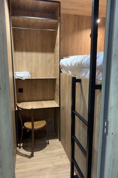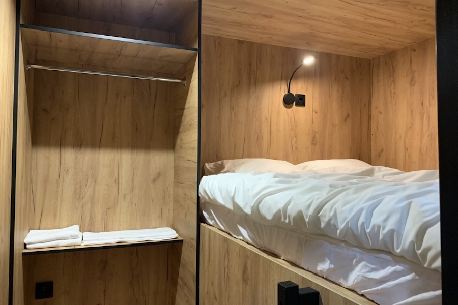 За 3 500 рублей в сутки можно забронировать двухместную капсулу площадью 6 м². В ней есть кровать размером 2 на 1,6 метра, шкаф, рабочий стол, стул, два вида освещения, розетки, вентиляция и полотенца для тела и ног. Капсула имеет индивидуальный вход с электронным ключом.