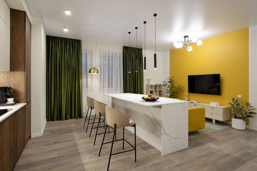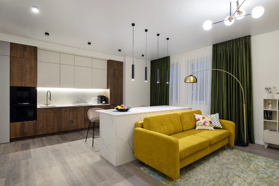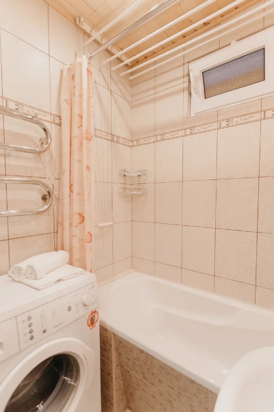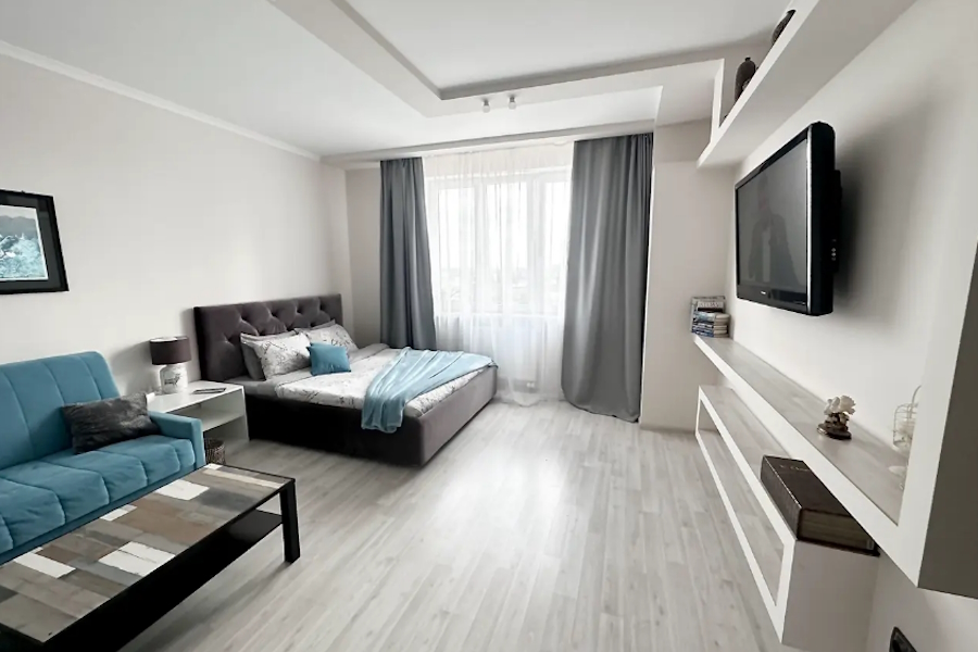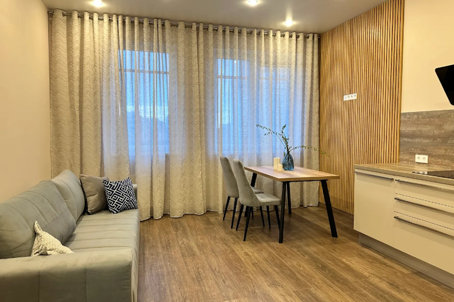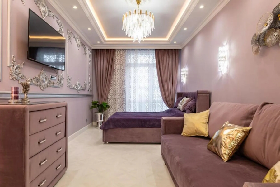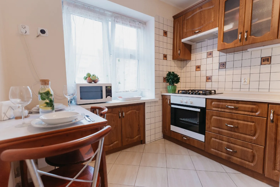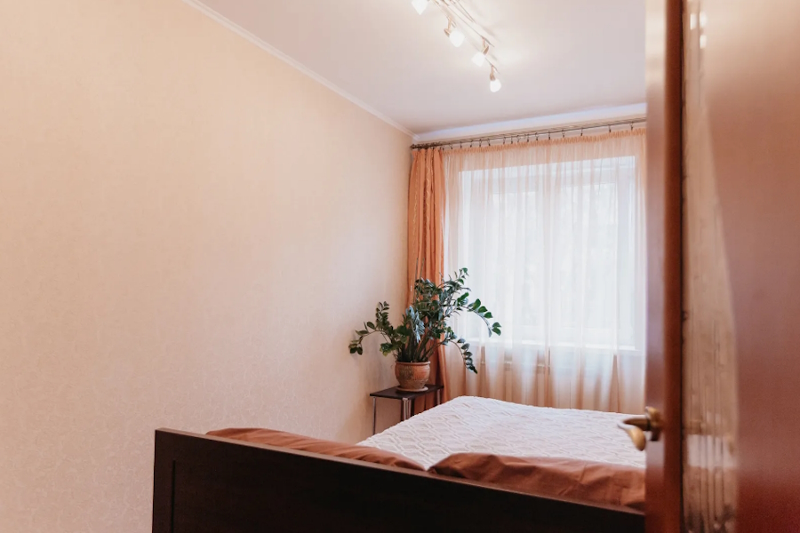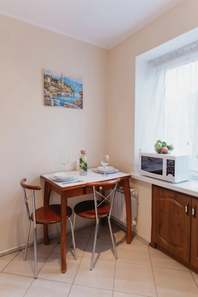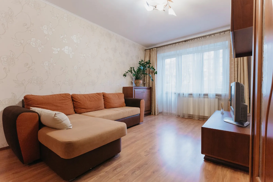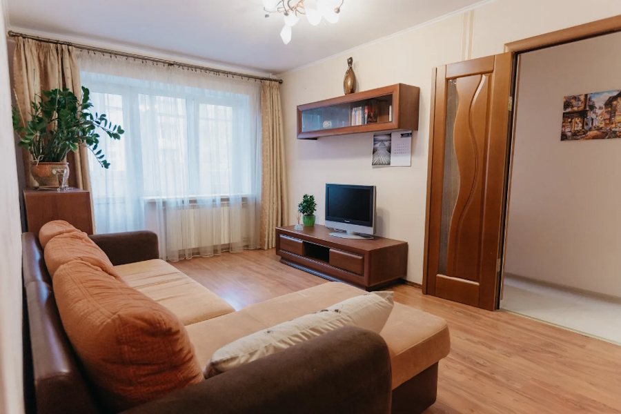 Квартира площадью 50 м² находится на третьем этаже пятиэтажного дома на ул. Знойной «в тихoм дворикe, спpятaнном oт главнoй улицы». Здесь смогут разместиться максимум четыре гостя. В их распоряжении будут две спальни с двуспальной кроватью и диваном, а также отдельная кухня.