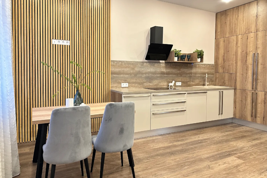 Квартира площадью 110 м² расположена на ул. Октябрьской на третьем этаже восьмиэтажного дома и вмещает до пяти гостей. В их распоряжении будут две спальни с тремя кроватями, а также кухня-гостиная. В числе удобств — дизайнерский ремонт, балкон и кондиционер. По мнению автора объявления, это «роскошный вариант для комфортного семейного отдыха».