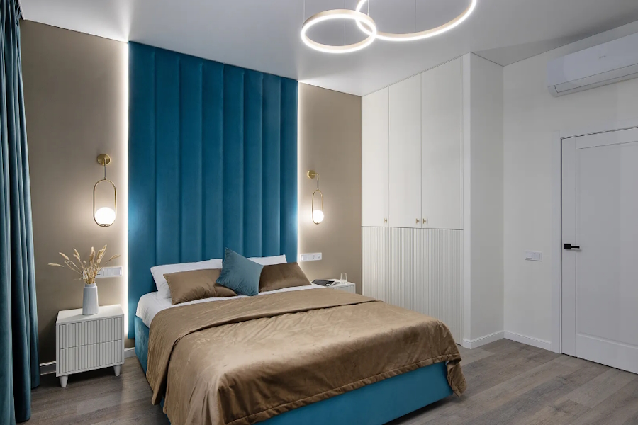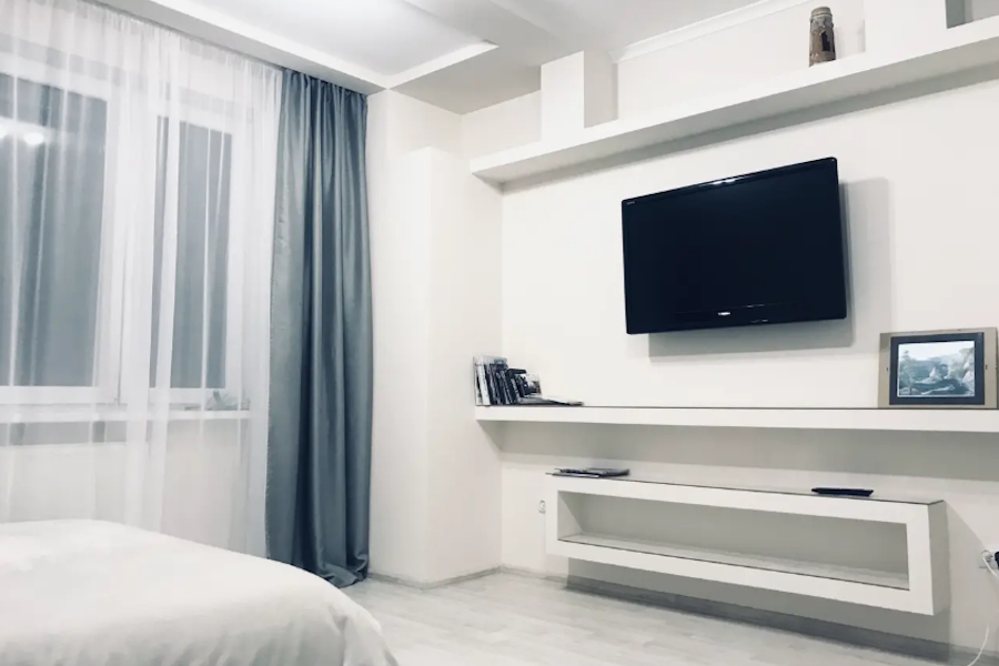Квартира площадью 98 м² находится на ул. Октябрьской на шестом этаже восьмиэтажного дома и вмещает до пяти гостей. Им предлагается разместиться в двух спальнях с двумя кроватями king-size и диваном. Также в распоряжении арендаторов кухня-гостиная, «отдельная просторная ванная комната с душем» и гардеробная. Кроме того, гостям обещают «видеонаблюдение, селекторную связь и бесключевой доступ».