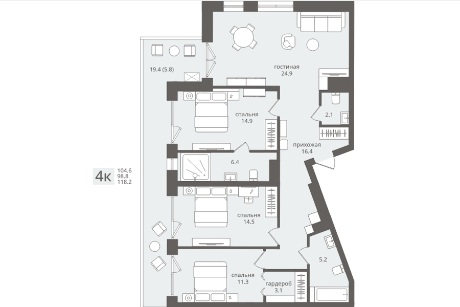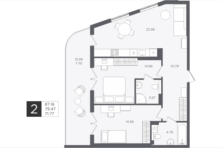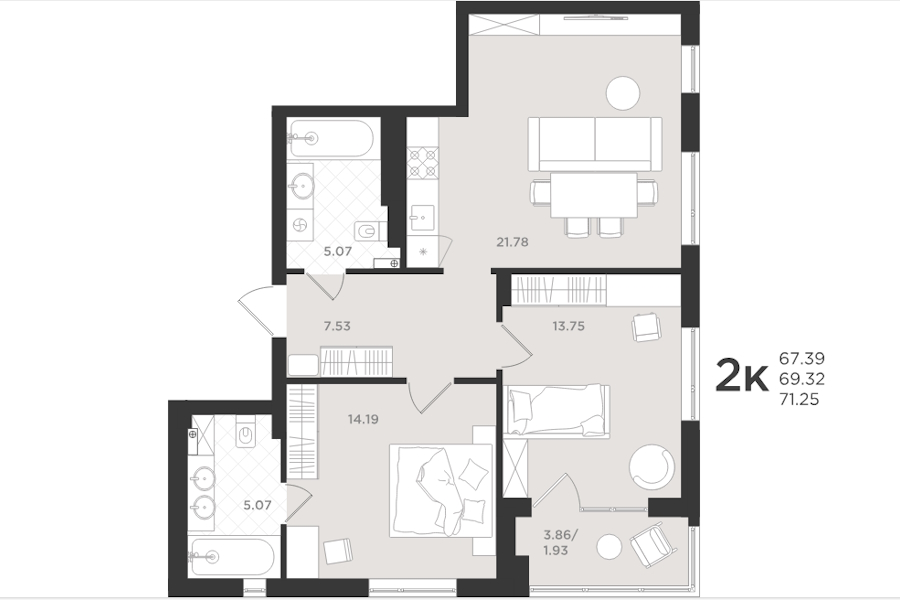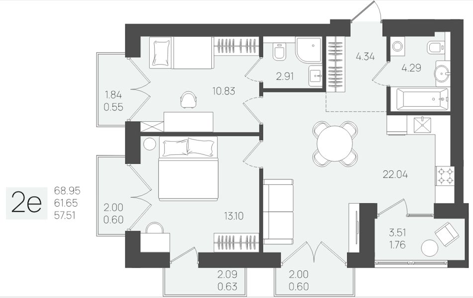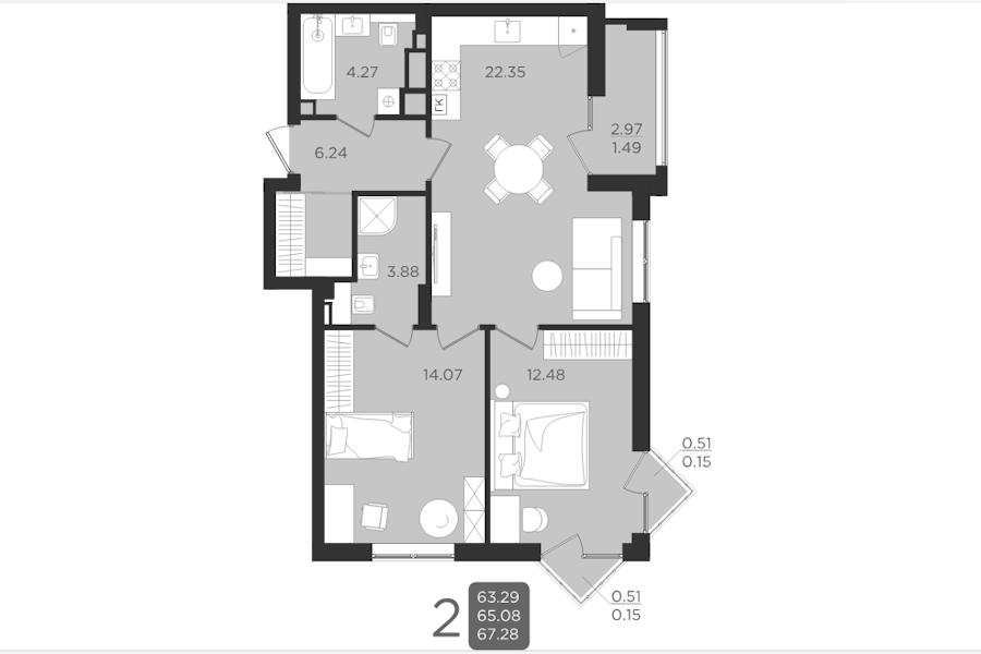 При том, что общая площадь квартиры относительно небольшая (усреднённо — 61,65 м²), в ней уместится всё для комфортного проживания: большая кухня-гостиная, мастер-спальня со своим санузлом и максимально светлая угловая спальня.