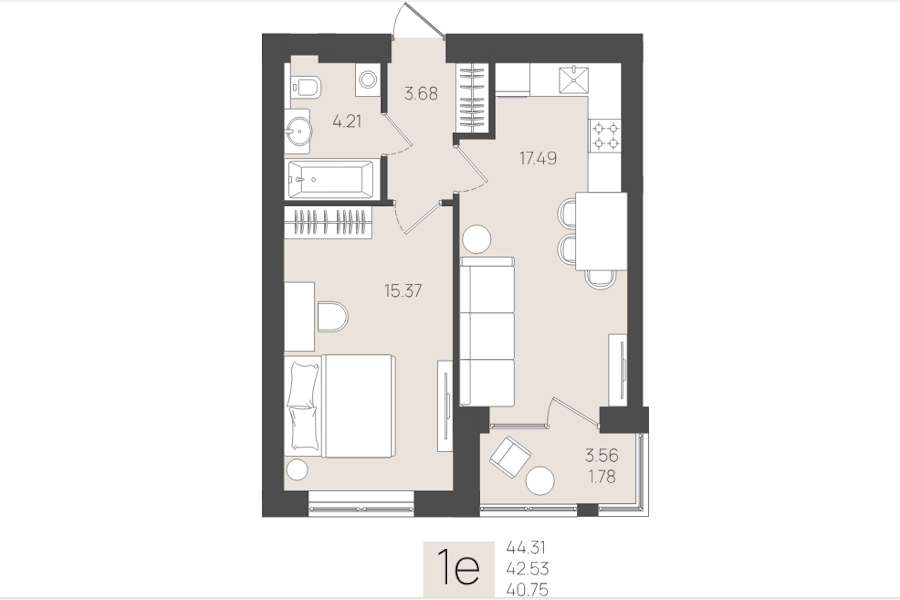 Это одна из популярных планировок однокомнатных квартир компании, предназначенных для побережья. На 38 — 44 м² смогут с комфортом проживать и вести быт до четырёх взрослых человек. Понимая, что это в большинстве случаев квартира выходного дня или объект для сдачи в аренду, застройщик немного сократил площадь прихожей в пользу более просторной кухни-гостиной.