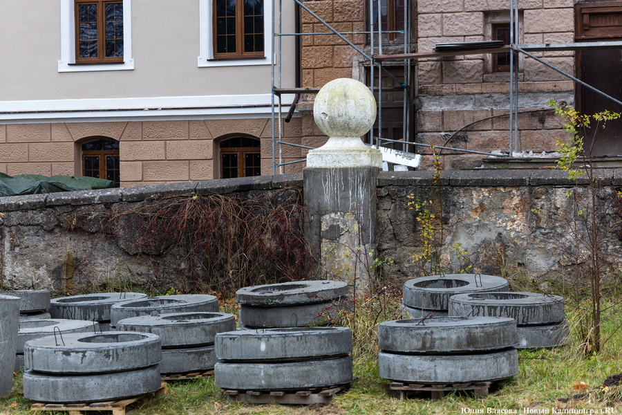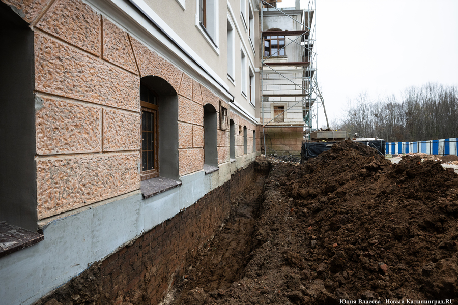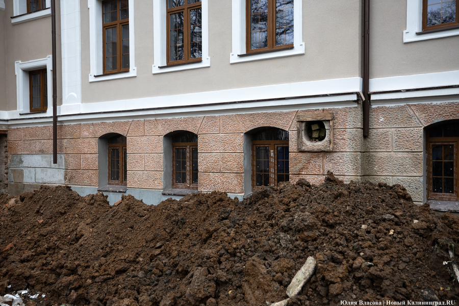 «На территорию завезли бетонные кольца, вдоль отмостки у нас сейчас экскаватором грунт снимают, чтобы найти точки вывода старой немецкой ливнёвки, — продолжает Воронин. — Заодно мы гидроизоляцию выполним. После этих работ мы уже сможем от здания отскочить и заняться прокладкой сетей — в ближайший месяц это у нас по планам, тепло на улице для этого нам не нужно».