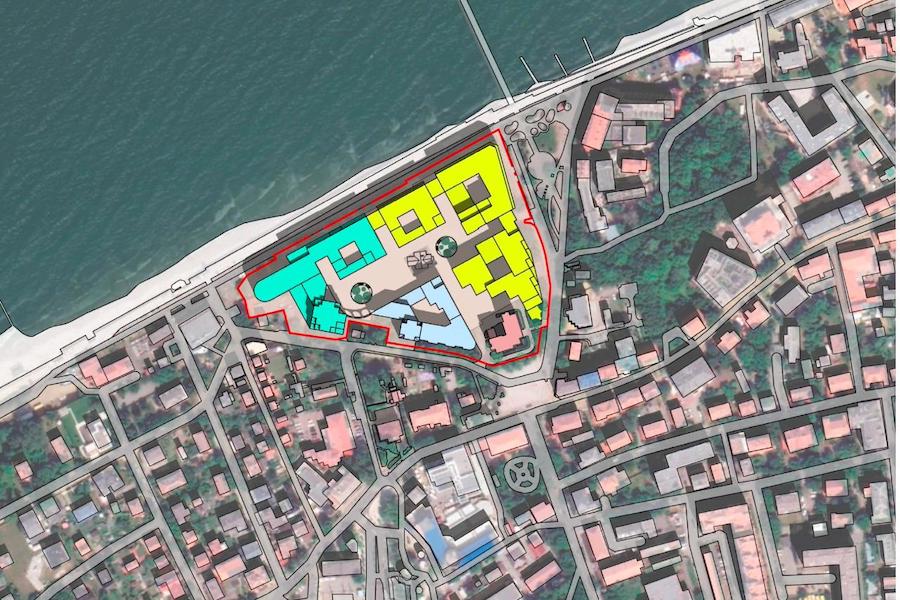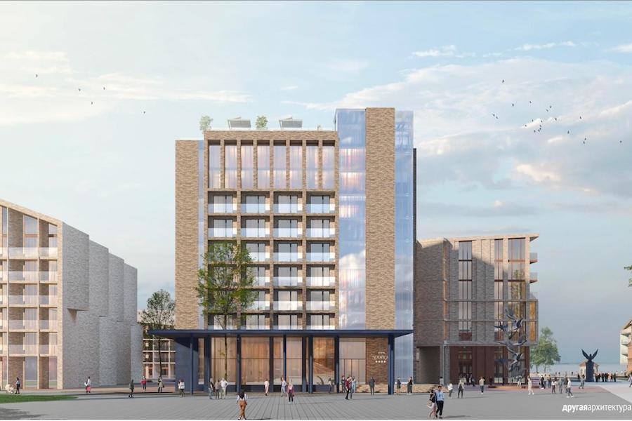 Представитель архитектурного объединения ArKuSS не смог представить проект лично, поэтому председатель градсовета Евгений Костромин сам пролистал презентацию, на которой можно было увидеть проект похожего на срезанный наискосок пирог восьмиэтажного пятизвездочного отеля, который должен встать на место снесенного больше десяти лет назад ресторана «Прибой» на променаде недалеко от пирса. Существующий ныне 9-этажный санаторий «Чайка» (это здание из красного кирпича стоит сразу за городской площадью около ЗАГСа) предлагается апгрейдить, не увеличивая этажность.