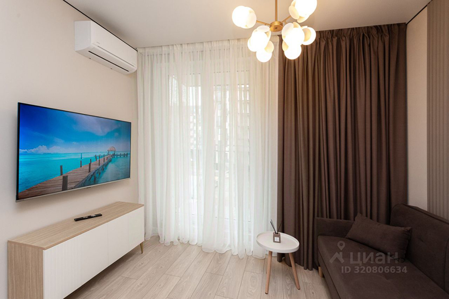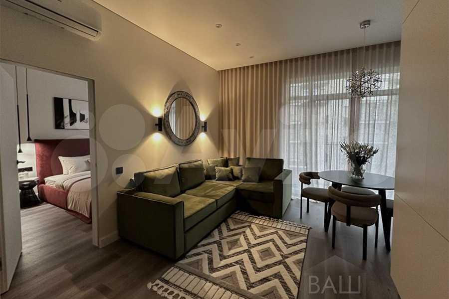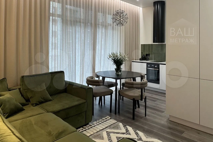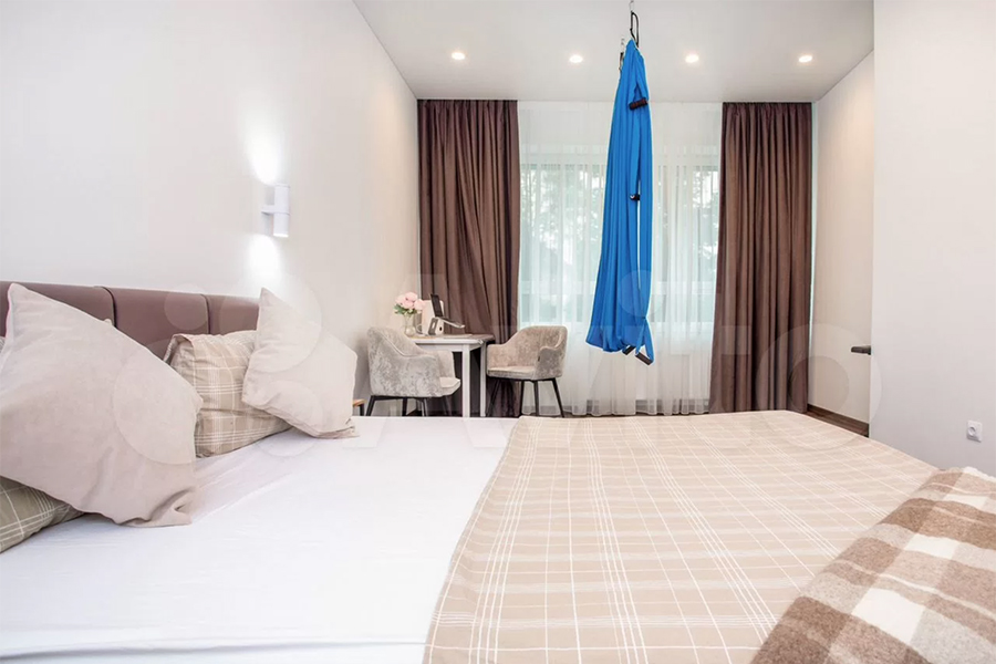 Кроме того, упоминаются «продуманная планировка и оснащение», шторы блэкаут, просторная кухня-гостиная с раскладным диваном, четыре рабочие зоны для удалённой работы, большой санузел и ортопедическая кровать. Любители аэройоги, вероятно, оценят съёмные крепления для спортивного гамака. Из техники можно выделить стиральную машину с функциями сушки и глажки.