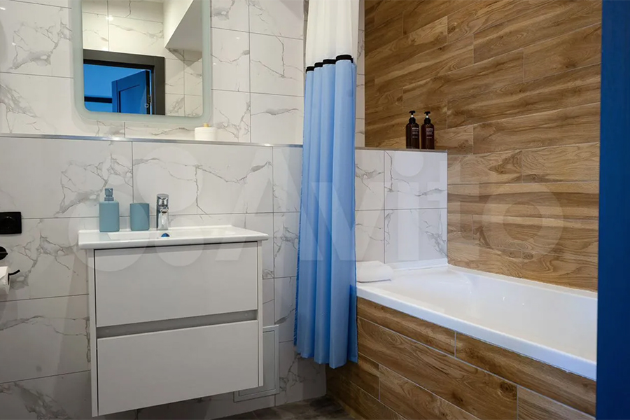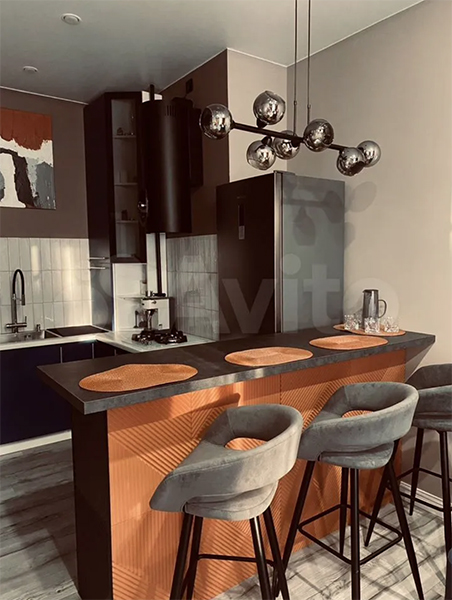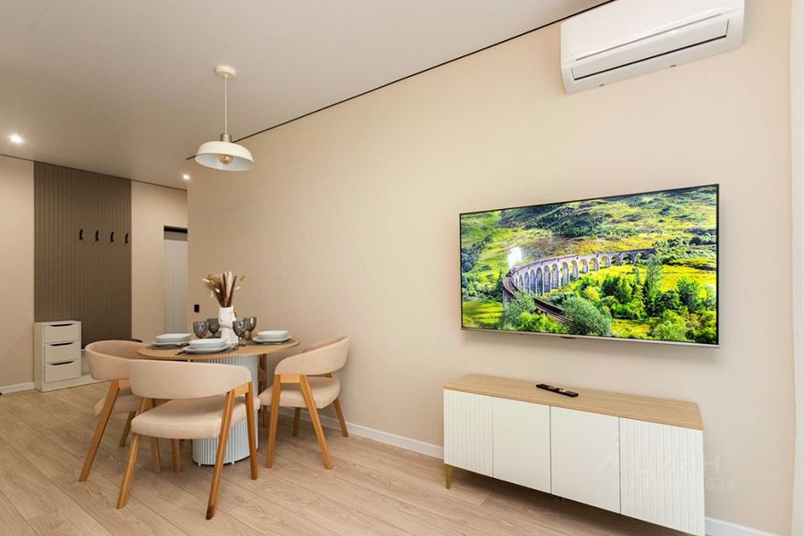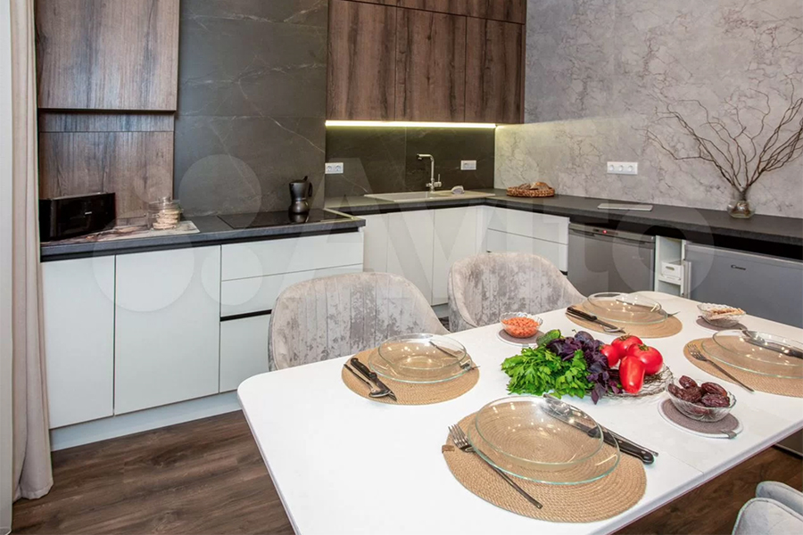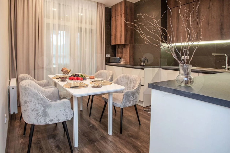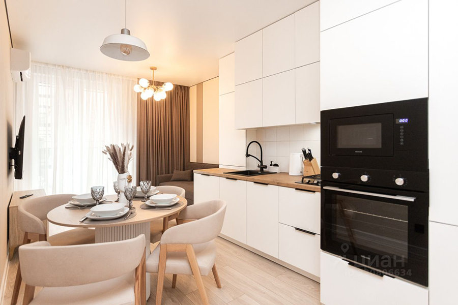 Квартиру с дизайнерским ремонтом площадью 46,6 м² можно снять на ул. Октябрьской на шестом этаже восьмиэтажки 2022 года постройки. Площадь кухни — 21,2 м². Максимальное количество жильцов не указано, однако среди них могут быть дети. Животные и курение — под запретом. В распоряжении гостей будут автономное газовое отопление, лоджия, кухня-гостиная, спальня и совмещённый санузел. Из техники — холодильник, стиральная машина, телевизор, посудомойка, кофеварка, кондиционер и чайник.