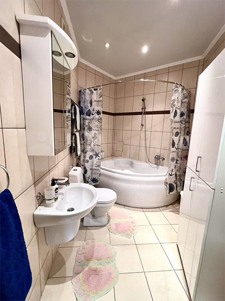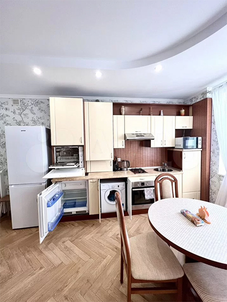 «В квартире сделан капитальный ремонт, в наличии вся необходимая мебель, посуда и техника: стиральная и сушильная машины, фен, духовка с пиролизом, индукционная варочная панель, холодильник, посудомоечная машина, микроволновка, чайник, миксер, блендер, мультиварка и даже вафельница. Во всех помещениях — полы с подогревом. Две спальни с кроватями 140 на 200 см с удобными ортопедическими матрасами. В спальнях сделана шумоизоляция», — говорится в описании. Шумные мероприятия и курение при этом традиционно запрещены.