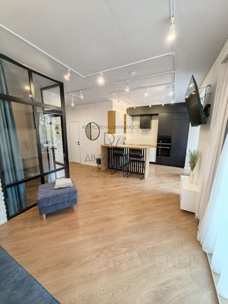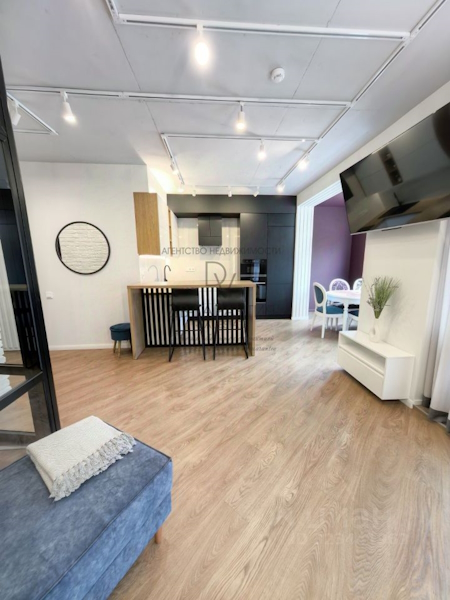 Внутри обещают «современный дизайнерский ремонт». «Спальня отделена от основного пространства поистине оригинальной дизайнерской находкой — перегородкой из металлической конструкции со стеклянными дверьми и шторами, что позволяет изолироваться от основной гостиной. В апартаментах есть светлая лоджия — отличная зона отдыха для утреннего кофе и планирования дня», — рассказывает автор объявления. За дополнительную плату можно пользоваться услугами спа-комплекса на первом этаже здания.
