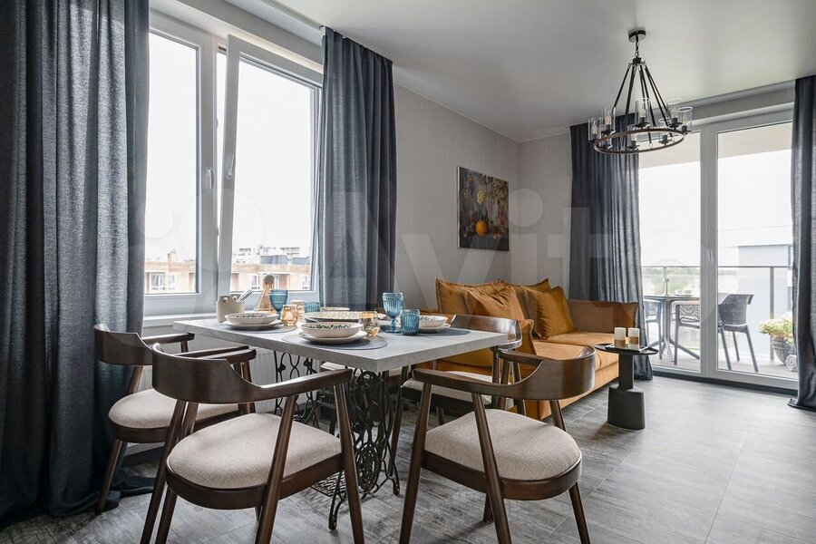 «Уютная» квартира площадью 55 м² с дизайнерским ремонтом в зеленом районе ЖК с закрытой территорией и парковкой обойдётся жильцам в 95 тыс. руб. в месяц. Во дворе расположены детская и спортивная площадки, беседка и шезлонги. «До автобусной остановки, ведущей в центр города, всего пять минут пешком. До автовокзала и железнодорожного вокзала в Калининграде — десять минут. В двух минутах ходьбы находятся магазины, аптеки, кофейни и пекарни. Рядом спортивный комплекс с ледовой ареной и бассейном», — отмечает арендодатель.