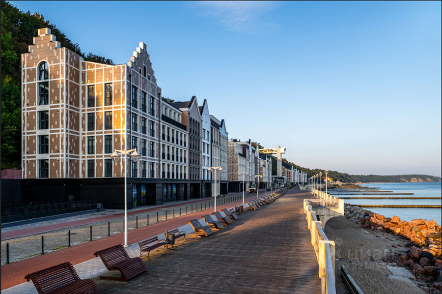 Однокомнатные апартаменты примерно той же площадью — 110,6 м² — предлагаются к покупке на последнем этаже пятиэтажки 2024 года постройки на ул. Верещагина. Комплекс «прославился» тем, что его возвели на месте бывшей одноимённой четырёхзвёздочной гостиницы. Отель «Русь», как известно, был закрыт и после снесён. Разрешение на строительство новой гостиницы на его месте правительство Калининградской области выдало в сентябре 2021 года. Ввести в эксплуатацию здание разрешили в январе 2025-го. На месте снесённого отеля строят также «Русь 2» и планируют построить ещё одну очередь зданий под названием «Русь-3», а на берегу возвести рельсовый фуникулёр. Проект получил одобрение на заседании градостроительного совета.