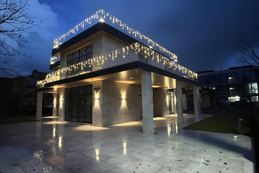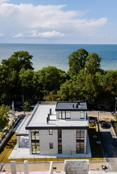 Трёхэтажная «вилла в современном стиле» 2024 года постройки площадью 608 м² расположена недалеко от береговой линии. До «кромки моря» обещают 50 м. На первом этаже расположены кухня-гостиная со вторым светом, гостевая комната, санузел, комната отдыха с сауной, хозблок. На втором этаже — три спальни (мастер-спальня с собственным санузлом), гардеробная, санузел. На третьем — панорамная комната отдыха с видом на море и выходом на террасу с зоной барбекю. Также обещают систему «Умный дом», видеонаблюдение, охранную и пожарную сигнализации, тёплый пол во всём доме, автоматическую систему полива газонов, плоскую крышу, на которой можно обустроить зоны отдыха и барбекю, и возможность переподключения на резервный генератор в случае аварийного отключения от городской сети. На участке парковка на шесть автомобилей.