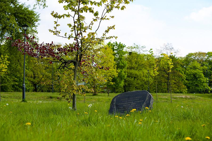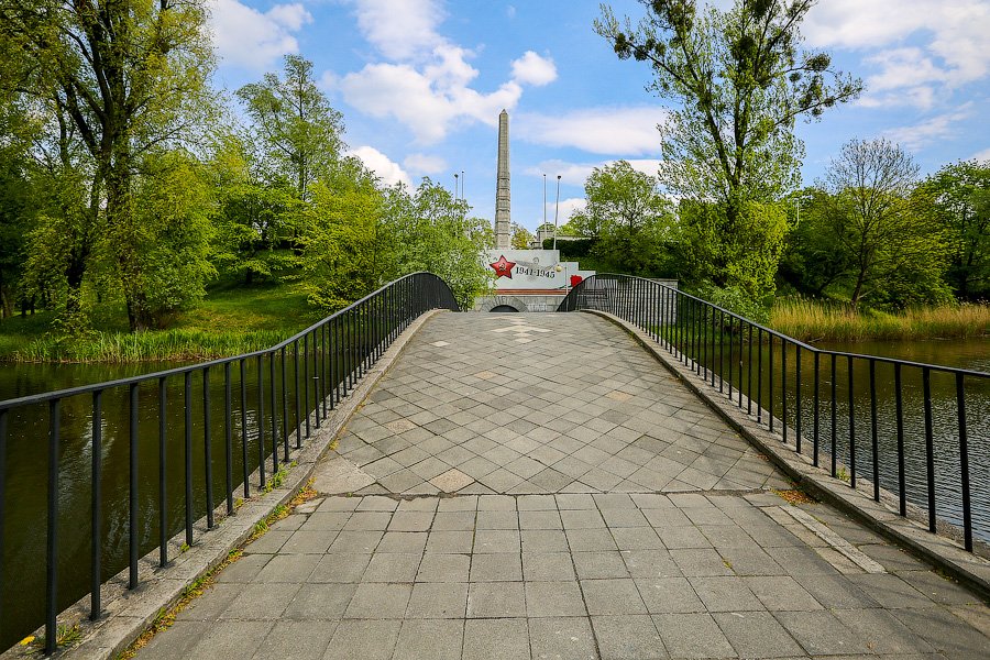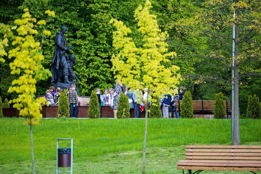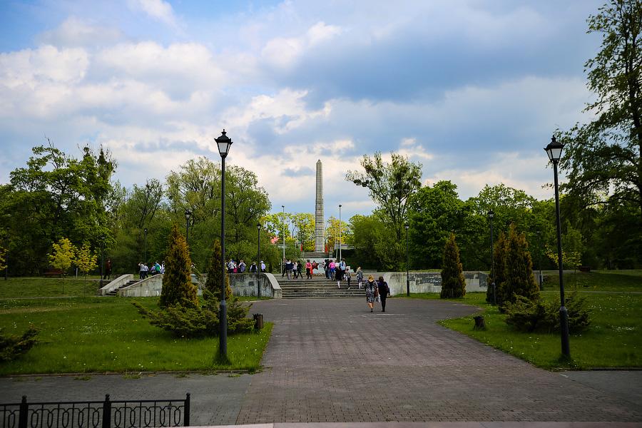 Перед Днём Победы в одноимённый парк начинается массовое паломничество как организованных групп, так и единичных неравнодушных граждан. Вот и во время нашей неспешной прогулки по дорожкам от монумента к монументу шустро передвигались две шумные группы школьников под чутким руководством учителей. Наверное, в этом обязательном возложении цветов и заключаются те редкие всплески яркой шумной жизни (попробуй заставить толпу детей молчать и не двигаться), которые иногда случаются в Парке Победы. С другой стороны, тишина здесь совсем не давит, она скорее умиротворяет. И если переносить на Калининград западный опыт открытых и не гнетущих кладбищ, то он должен выглядеть именно так — простор, тишина, чистота и ослепительно зелёный почти не топтанный газон.