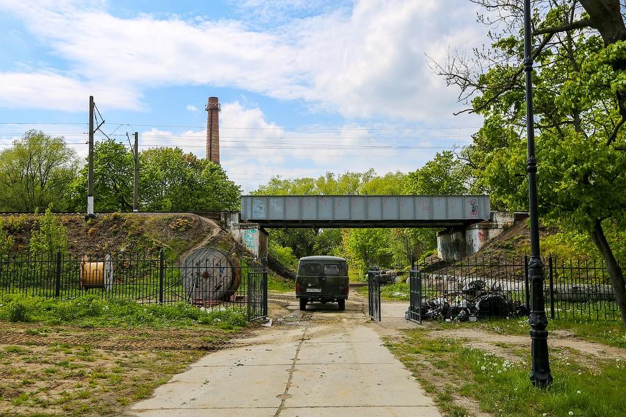 Кстати, от немцев помимо Железнодорожных ворот здесь же остались ещё и Аусфальские. Правда, воротами они перестали быть ещё в довоенное время, а в 90-х на их верхнем покрытии была построена православная часовня, посвящённая солдатам, павшим при штурме Кёнигсберга. Остатки ворот ещё можно увидеть со стороны парка. Со стороны города они давно засыпаны землёй.