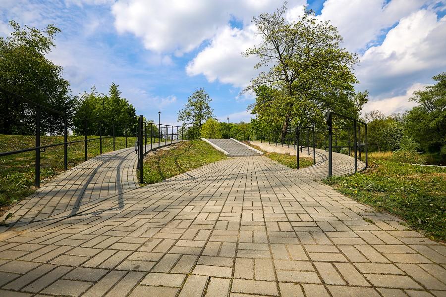 Временами звенящая тишина прерывается проходящими по соседней насыпи поездами, но и это почему-то кажется уместным. А вот если отдалиться от средоточия монументов мимо свежепосаженных юных деревьев к недавно отремонтированным Железнодорожным воротам, то взору открывается вторая часть парка, незаконченная. Ворота, реставрация которых закончилась не так давно, стоят пустые и почему-то даже без опознавательных знаков. Рядом на площадке сиротливо притулились те самые туалеты за 300 тысяч рублей, открывать которые запретили по соображениям госбезопасности. Дальше в южной части парка зачем-то прямо на газоне наблюдается скопление фонарей, вдоль уходящей вдаль дорожки нет ни одной лавки, а ограждение у площадки возле озера почему-то присутствует только частично. И непонятно, то ли работы по благоустройству идут, то ли их пока что отложили.