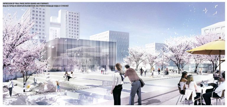 По сути, это всё больше всего напоминает уплотнительную застройку центра со строгой уличной структурой. Дом Советов в проекте становится новой культурной точкой города, а Центральная площадь так же частично застраивается в рамках исторической структуры местности. Музей города строится на месте замка, внутри нового здания остаётся территория раскопок. Между Нижним озером и Московским (а то и Преголей) строится некая «Площадь воды» с подземным водным буфером и ансамблем «Водные ступени». Судя по всему, планируется задействовать каскады Дома Советов. Между «Площадью воды» и загсом образуется площадь Бракосочетаний. На Южной террасе замка организуется новое общественное пространство, соединённое с пространством Житомирской и продолжающееся до университета и площади Канта.