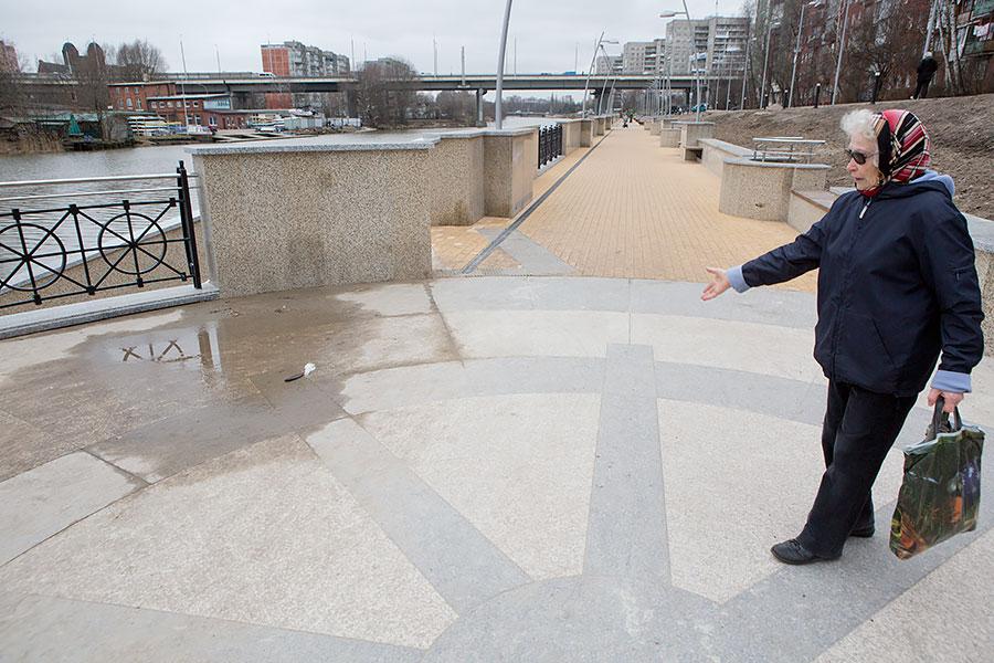 Утром в среду, увидев корреспондента с фотоаппаратом, местная жительница Нина Яковлевна, прогуливавшаяся по набережной, решительно заявила: «Пойдёмте со мной, я покажу вам место, где лужа не высыхает уже неделю!» Лужа на самом деле есть на одной из площадок с орнаментом штурвала. По мнению Нины Яковлевны, это явное свидетельство того, что в этом месте не обеспечен слив дождевой воды. Женщина, которая живёт на Трибуца уже 40 лет, вообще настроена очень решительно. Нина Яковлевна говорит, что пыталась добраться до начальства