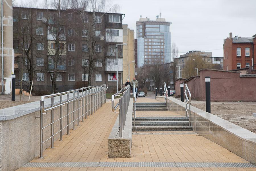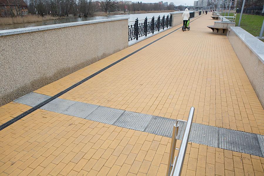 Почти все спуски на набережную оборудованы пологими пандусами. Кроме одного — возле детской поликлиники. Здесь установлен специальный подъёмник для инвалидов. В мэрии рассказали, что лифт удалось сделать более удобным, благодаря советам