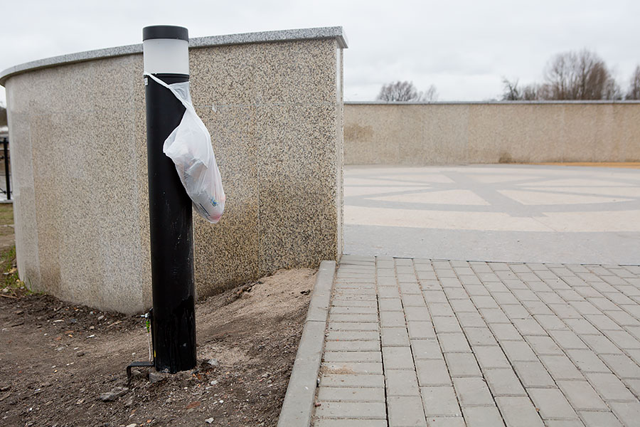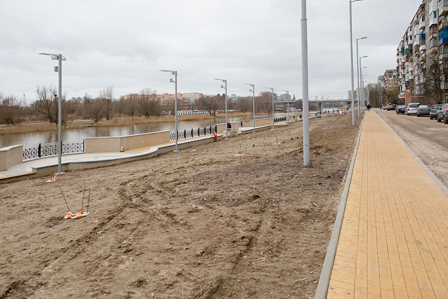 Ни одной урны на набережной пока не установлено, но они уже заказаны и к концу марта должны прибыть. По словам подрядчика, для их установки будут сверлить плитку. На скамейках и не засаженных клумбах, тем временем, уже видны следы