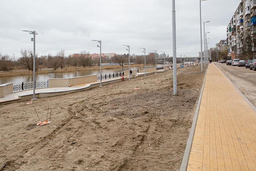 Пока что набережная бесстыдно демонстрирует голые склоны. Некоторые молоденькие деревца уже поломаны природолюбивыми калининградцами. «Что касается посева газонов, то в апреле трава взойдет. Мы посев выполнили, потому что это было предусмотрено условиями контракта, но прекрасно понимали, что весной придётся заново это делать. Может, сейчас даже, чтобы было быстрее, сделаем гидропосев, — комментирует „обнажёнку“ руководитель «УКСа». — Гарантированно в короткие сроки взойдет нормальная трава. Видели уже, пока прогуливались, что граждане собак выгуливают, ходят прямо по этой территории. Жандармов не поставишь, которые будут отгонять всех, поэтому будем решать эти вопросы. Безусловно, будет зелёная зона».