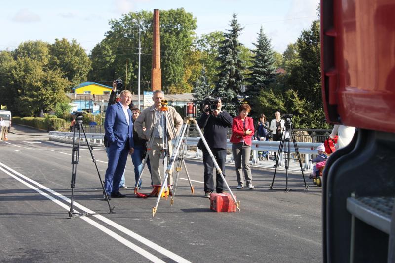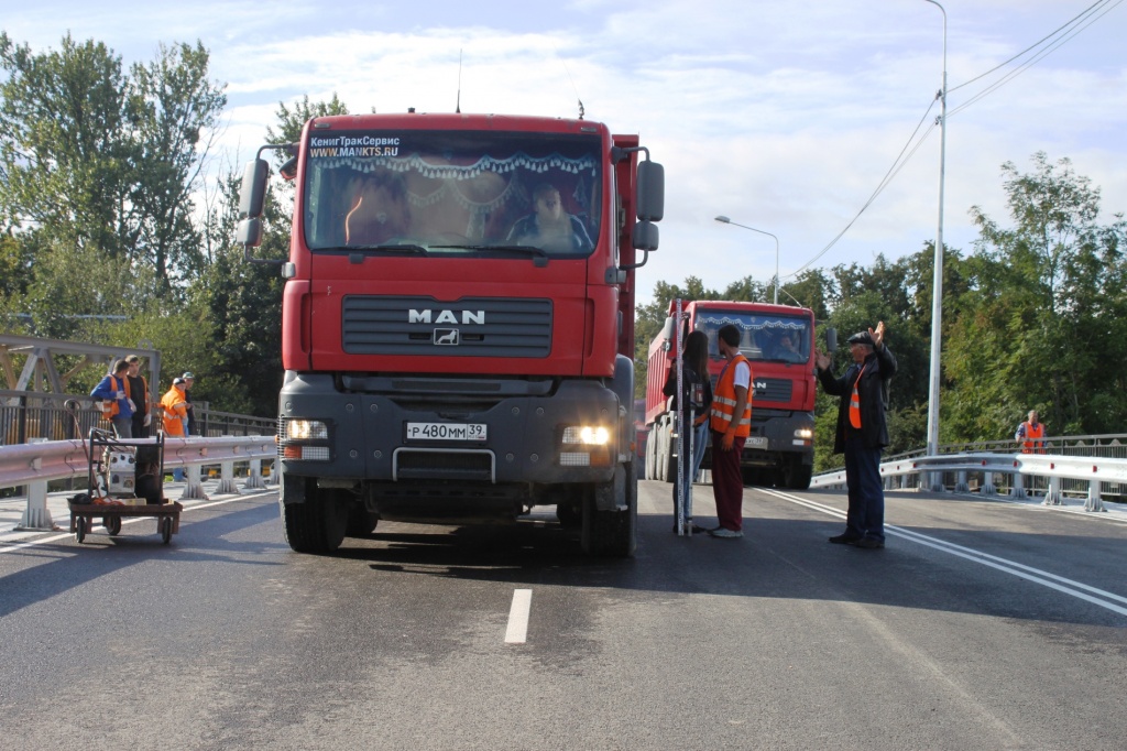 Вскоре показания сняты, и грузовики съезжают с моста. Как сообщает директор МКУ «Городское дорожное строительство и ремонт» Владимир Свинцов, прогиб составил 3 мм при максимально допустимом прогибе в 3 см, а это значит, что мост готов к открытию движения. Впрочем, до 18 сентября ещё планируется докрасить некоторые элементы и исправить мелкие недостатки. От реверсивного движения в итоге было решено отказаться — будет действовать две полосы на въезд в город, и одна — на выезд. Велодорожек на новом мосту тоже нет, есть только пешеходные полутораметровые дорожки на двух выносных консолях.