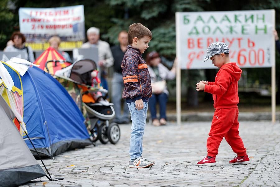 В субботу на пикете собралось не меньше сотни человек с растяжками и плакатами с требованием вернуть деньги. На площадке установили десяток разнокалиберных палаток, развесили детские рисунки и письма дольщиков к врио губернатора Николаю Цуканову. Многие пришли с детьми, а