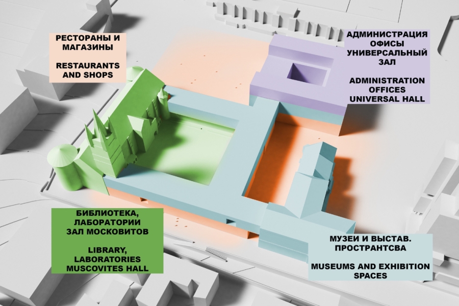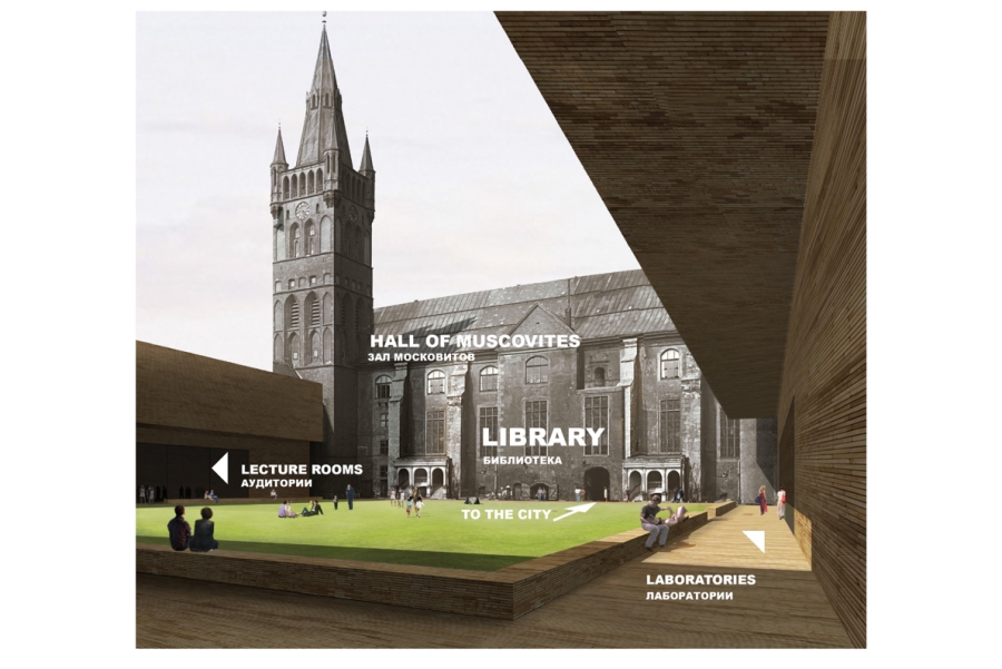 При этом основной акцент в проекте сделан именно на новых открытых публичных пространствах. Объёмы в данном случае необходимы для создания самой структуры этих площадей. Многофункциональный зал и административные помещения архитектор оттеснил к площадке бывшей «Старой башни», разместив их в шестиэтажном здании Конвента. Дом Советов калининградец трогать не стал, рассудив, что он и так достаточно хорош и заслуживает собственного проекта благоустройства.