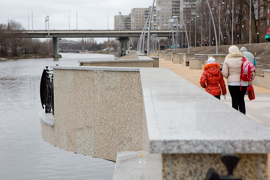 В начале марта журналисты «Нового Калининграда.Ru» прогулялись по свежепостроенному участку набережной и обнаружили, что объект ещё не сдан, а плитку уже «повело», лавки растрескались, вода не уходит, а урн нет. После этого на объект началось паломничество чиновников вместе с подрядчиком — все эти делегации терпеливо объясняли журналистам и друг другу, что объект в процессе сдачи, плитку переложим, вот уже перекладываем, лавки ломают толстые калининградцы, урны уже в пути, и вообще всё тут замечательно. А что спусков не хватает и пандуса возле поликлиники нет — это уже недостатки проекта, это не подрядчик. Но пандусом займёмся, да. И дорогу возле домов потом сделаем. А то что велодорожка узкая — не беда, разъедетесь