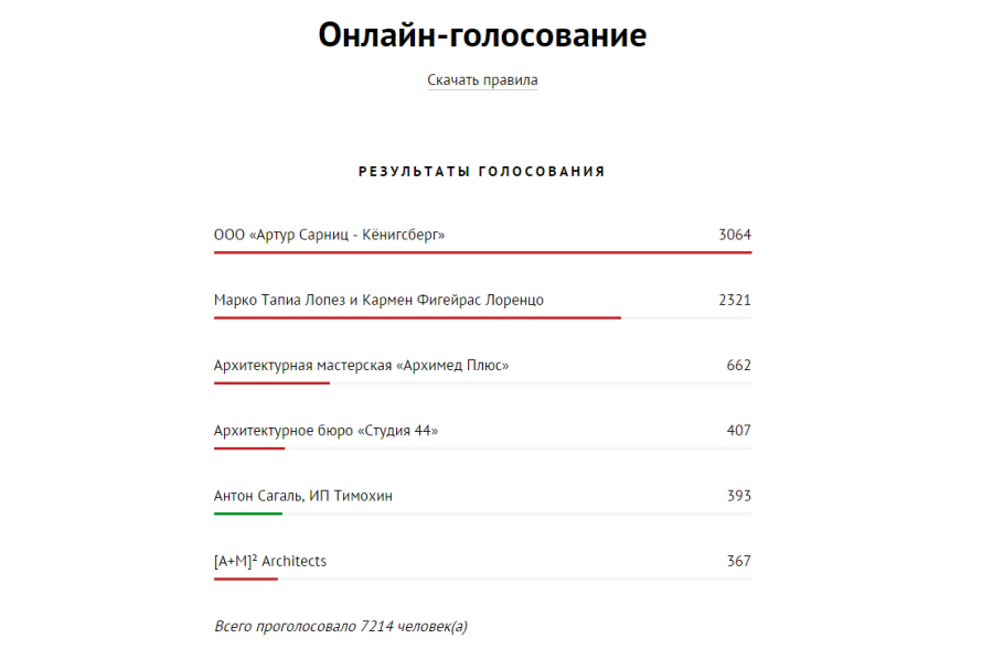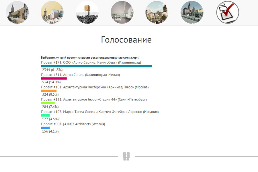 В выборе победителя мнение пользователей совпало в обоих голосованиях — первое место безоговорочно занял калининградский архитектор и друг губернатора Николая Цуканова, известный адепт восстановления исторического центра города и конкретно замка Артур Сарниц. В голосовании на «Новом Калининграде.Ru» его концепция, подразумевающая восстановление Королевского замка, а также исторических кварталов вокруг него (с обязательным сносом хрущевок) получила 2344 голоса, обеспечив невероятный отрыв и закономерное первое место. «В основу концепции