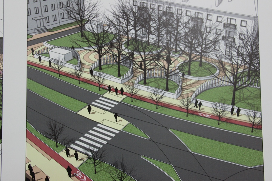 В задании была представлена не существующая ситуация, а разработанная транспортная схема. В свою очередь архитектор её слегка подправил, оставив пешеходный переход и добавив островки безопасности. На одном из участков он предложил не трогать деревья, оставив местным жителям территорию для отдыха. Там предложено выстроить вокруг деревьев подпорные стенки, которые можно использовать в качестве лавок.