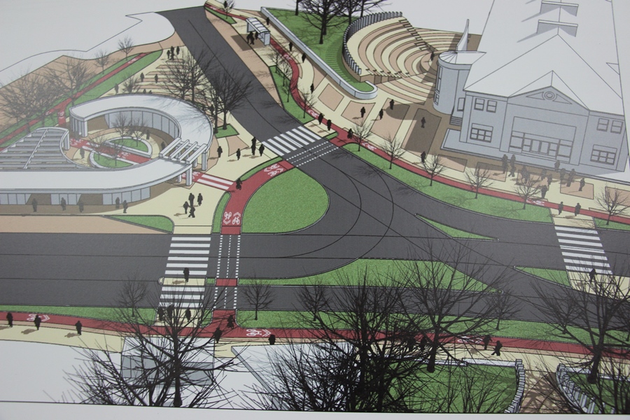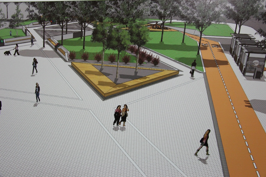 На пятачке остановки, где узел схождения улиц, архитектор предложил установить торговые павильоны, а при возможности — использовать их под велопрокат или велокафе. Специально для велосипедистов через центр пятачка проходит дорожка.
